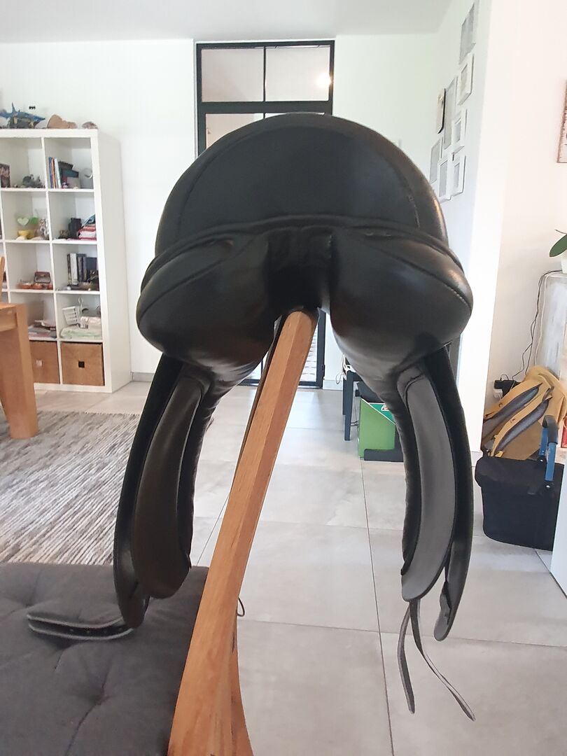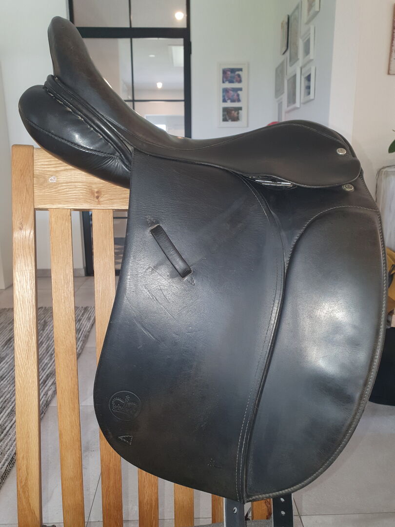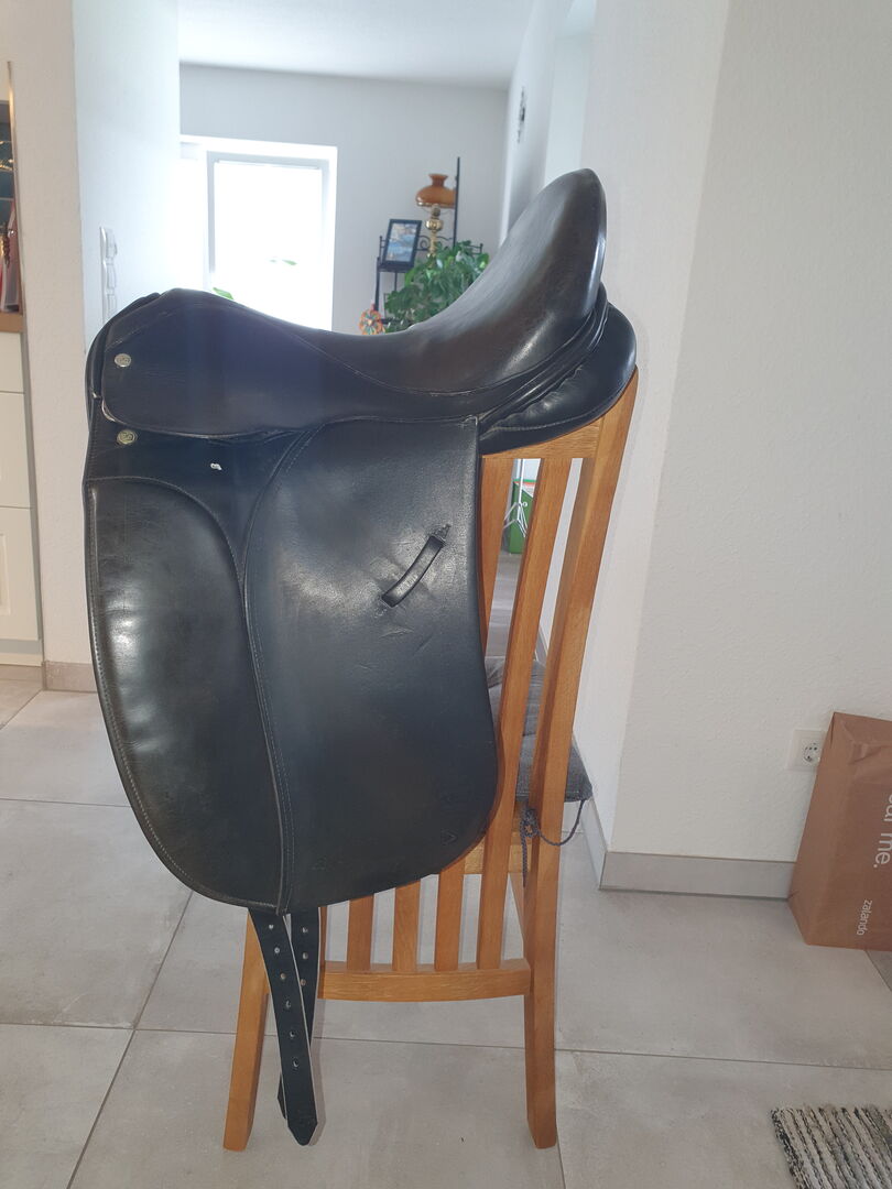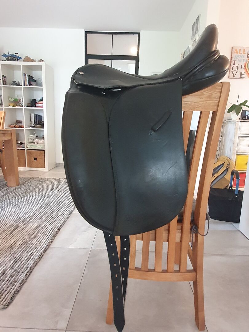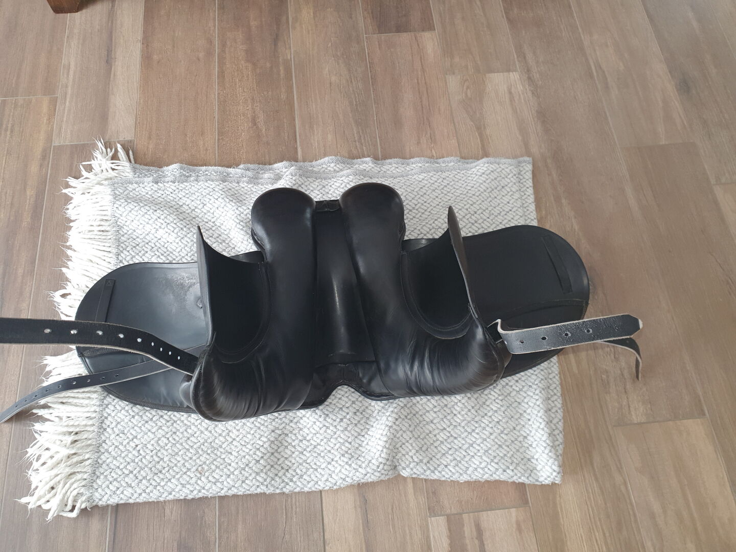 Välskött dressyrsadel Windsor, 16 tum - Jag säljer vår dressyrsadel eftersom den inte längre passar perfekt på vår ponny i sista storleken. Det är en engelsk Windsor-sadel, Walsall, Springtree och är 16 tum. Gulletbredden är förmodligen cirka 32 cm. Han har nyligen varit hos sadelmakaren för en kontroll och har fått 4 nya paneler monterade. Tyvärr kan jag inte berätta hur gammal den är, vi köpte den förra året med vår ponny. Sadeln vårdades regelbundet, förvarades varmt och torrt och användes fram till förra månaden. Sadeln har inga skador, men visar tecken på slitage. Stoppningen är bra, inte hård eller "knubbig". Vänligen kontakta mig om du har några ytterligare frågor