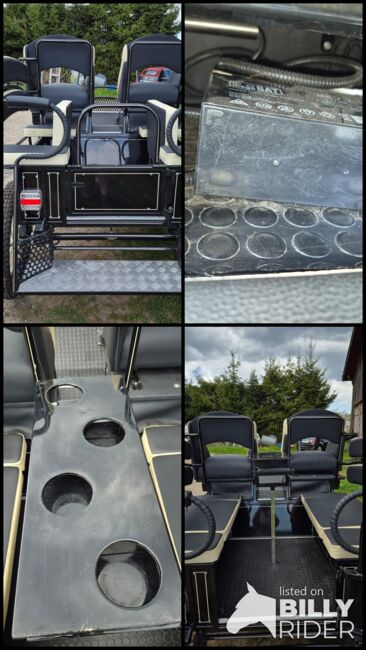 Vagn, maratonvagn, körskolevagn, ponnyvagn, hästdragen vagn - Min mycket älskade maratonvagn är till salu, min draghäst går i pension. Vagnen är 6 år gammal, välskött, totalrenoverad, visar tecken på användning. 4-hjulsdäck, skivbromsar fram och bak, parkeringsbroms, indikatorlampor och lampor med batteri under passagerarsätet. Justerbar förarstol, bakre bänkar utrustade med förvaringsfack, bakre säkerhetsdörr, bord med dryckeshållare kan monteras och tas bort. Saxar för draghäst 90 cm breda, för hästar och ponnyer från ca 140 cm. Dragstång för körning med två hästar ingår också. Spårvidd på vagnen 125 cm. Vikt ca 300 kg. Vagnen har alltid gett oss mycket nöje, den kör utan problem. Kom och titta på den, den kan transporteras på en biltransportör eller en stor hästtrailer.