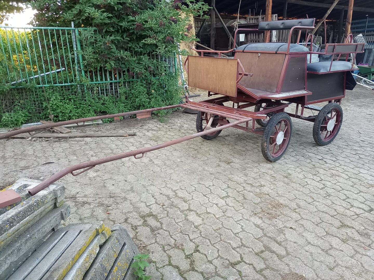 Vagnen genomgick en teknisk översyn för två år sedan och kördes sedan tyvärr inte längre på grund av tidsbrist och byte av häst. Plats: vagnslider (torr). Den är lätt och rullar bra.