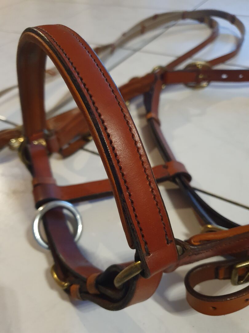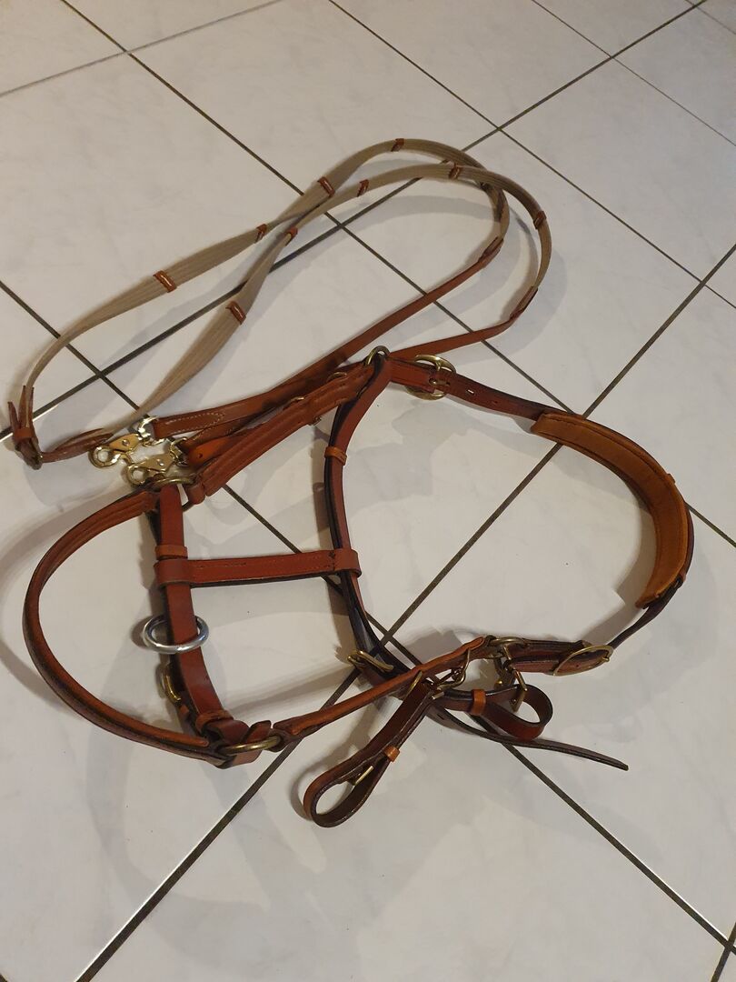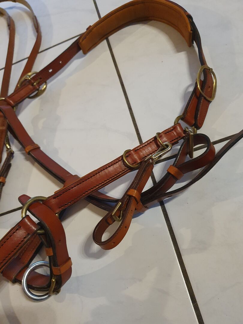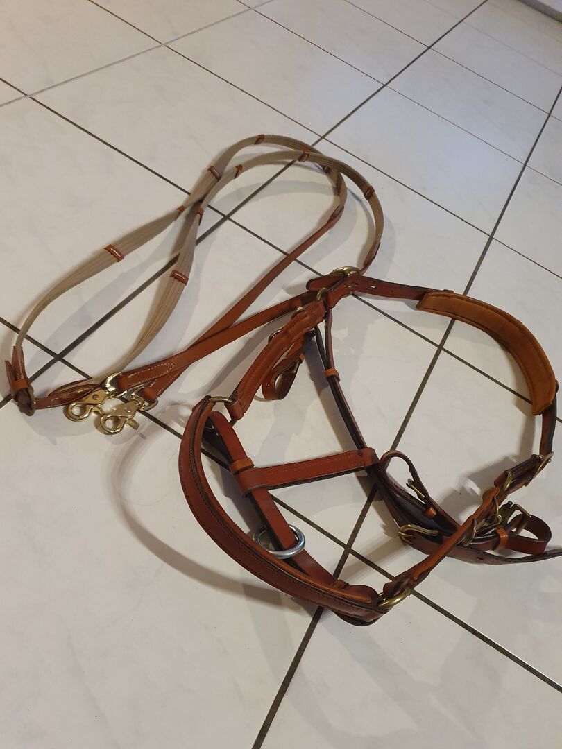 Vandringsträns Vandringsnosband Vandringsträns, cognac, toppskick - Jag erbjuder ett fantastiskt promenadträns tillverkat av högkvalitativt cognacsfärgat läder med guldfärgade beslag. Storleken är angiven som "universalstorlek". Min häst är 1,64 och har varmblodsstorlek i andra träns - och i det här tränset finns det utrymme för att göra det smalare eller bredare i båda riktningarna. Bettet kan fästas på läderremmar, som kan lossas med en karbinhake för ridpauser eller trailerturer. Jag inkluderar också de separat inköpta tyglarna med tryckknappar och en extra läderkudde i matchande färg. Jag köpte alla delar på en mässa i Stübben-montern, men varorna är inte stämplade med varumärket. Tränset har bara använts ett fåtal gånger. Min häst är nu för gammal för långa ridturer och tränset är för bra för att bara ligga framme. När tränset kommer till sitt nya hem har det rengjorts och smörjts in i förväg. Jag har lagt till en metallring på hakremmen. Det är praktiskt att knyta på, men tyvärr är ringen silverfärgad och det fanns inget annat att köpa i byggvaruhuset. Jag säljer till fasta priser från privatpersoner utan garanti, reklamation och/eller retur. Betalning är möjlig genom förskottsbetalning via PayPal (AGB-kompatibel!), Efter mottagande av betalning kommer jag att skicka inom kort och ge spårningsnumret. Frakt inom Tyskland är möjlig - uteslutande av DHL - till filialpriset. Kostnader: 7,69 euro upp till 5 kg, 10,49 euro upp till 10 kg och 18,99 euro upp till 20 kg. Ingen internationell frakt. Alternativt kan varan hämtas hos mig mot kontant betalning efter överenskommelse. Om du inte håller med om priserna och fraktkostnaderna, vänligen köp någon annanstans. Fraktkostnaderna är 1:1 av vad jag måste betala. Och mina priser är redan satta vid min smärtgräns.