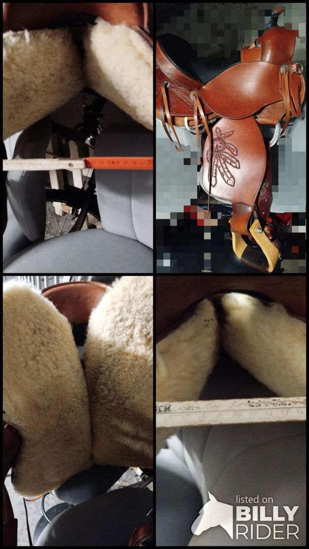 Sadeln har ett träträd och är superbekväm. Sitsen är 15 tum. 90 graders vinkel gjord för Quarter Horse. Total längd 65 cm (kort) Gunga