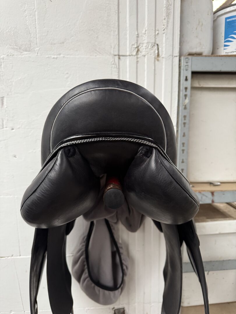 Velicea Onyx dressyrsadel - Jag säljer min Velicea Saddlery modell Onyx dressyrsadel. Den är svart med grå sömmar och svart lack. Sitsstorlek 17 tum. I november 24 smalnades sadelklaffen av och förnyades, därav sömmarna på båda sidor. Sadeln stoppades också om vid samma tillfälle. Den har alltid varit väl omhändertagen och ser ut som ny!