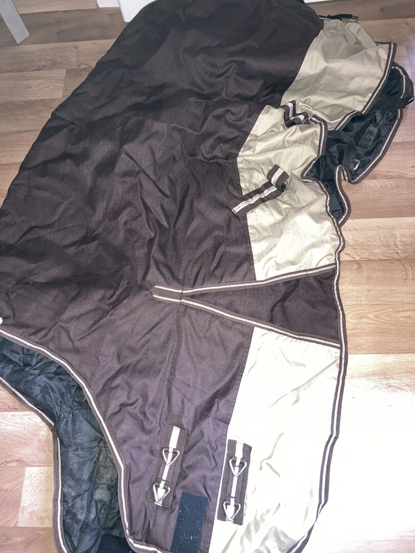 Vinterfilt 200g i 125cm - Vinterfilten i färgen brun/beige är i mycket gott skick. Filten har bara använts i några veckor och det finns inga skador. Den skulle på sin höjd behöva tvättas. - Vattentät och vindtät - vadderad manke - Kryssgjordar med metallfästen - svansklaff och avtagbara benöglor