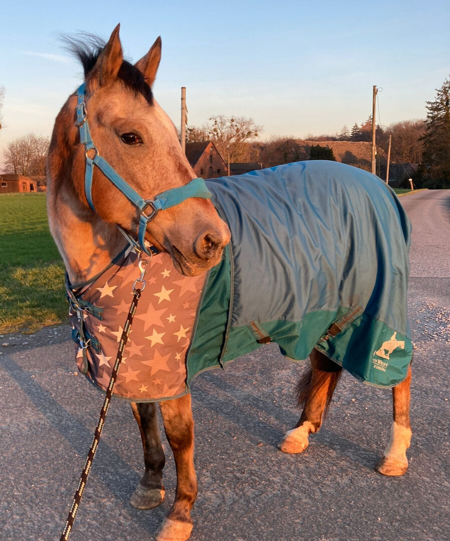Vintertäcke 155 cm från Appaloosa - Jag säljer en vacker vinterfilt fodrad och regntät från Pro West i Patrol med stjärnor Filten är i mycket bra skick Och tvättat Jag har även en grimma med rep i samma färg 40,-