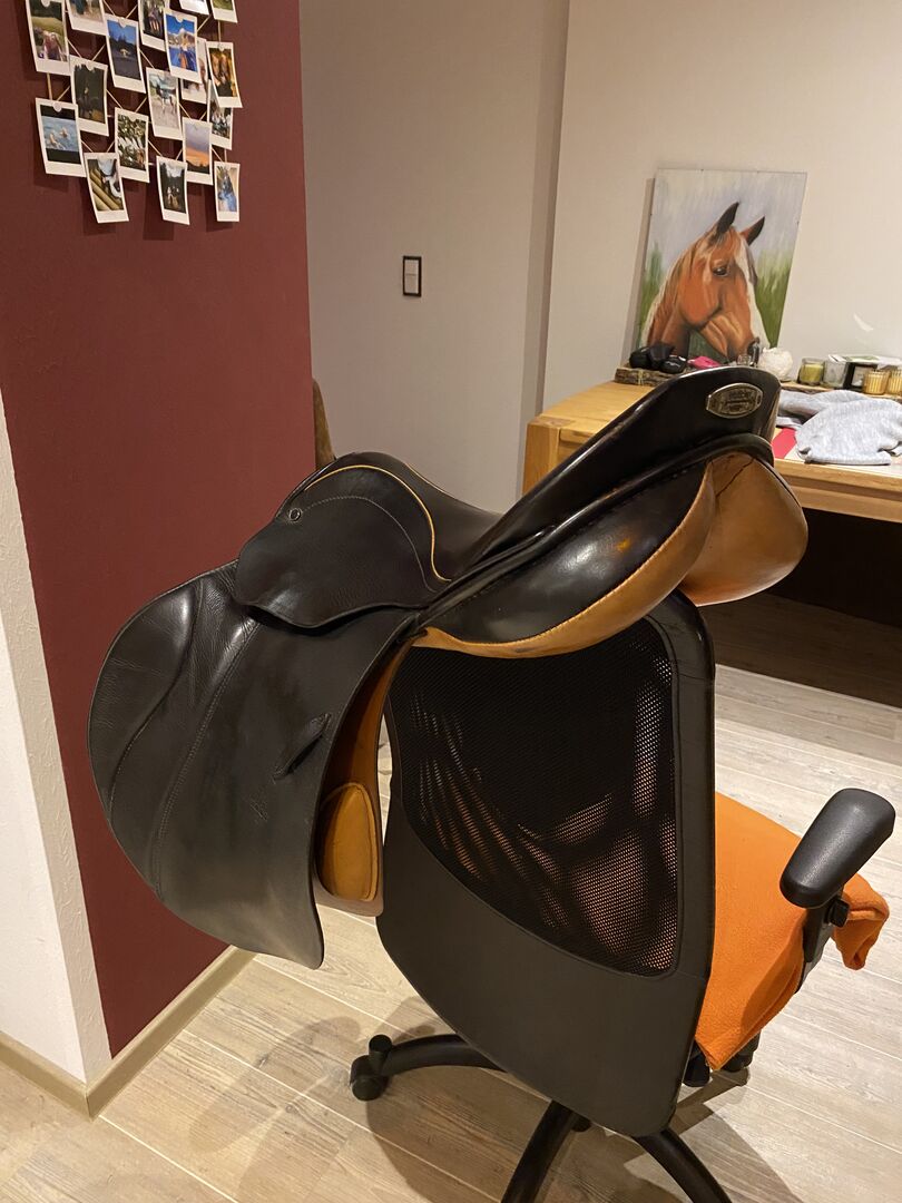 VS sadel svart brun - Jag säljer min fältsadel från märket Stübben. Den är svart upptill och brun nedtill, vilket gör att den ser väldigt slående ut på hästens rygg. Den är begagnad och i mycket gott skick. Den har knappt några tecken på användning och materialet är fortfarande mycket välgjort. Den har också fortfarande mycket bra stoppning i knävecken etc. Den är lämplig för en häst med hög mankhöjd. Sadeln användes av en relativt stor tysk ridhäst, som tyvärr gick bort. Storlek: 17,5 tum (45 cm) Sittdjup: 6 cm Sadelklaff: 35cm Sadelns panel: 49 cm Kammarens bredd: 14 cm Centrumbredd: 26 cm !! Allt detta har jag bara mätt med en tumstock som en grov vägledning. Dessa värden är inte 100 procent exakta. !! Fraktkostnader 20,- €.