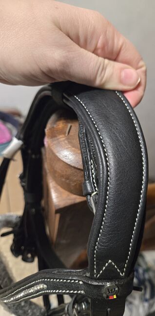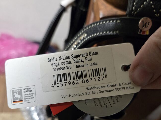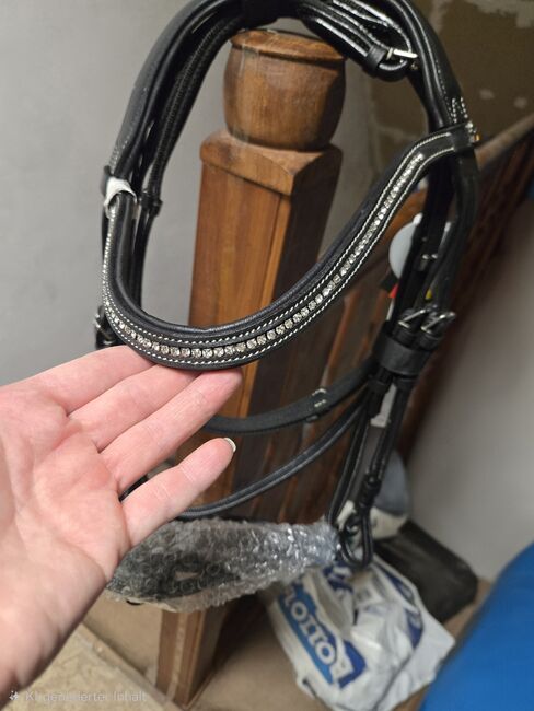 Waldhausen Snaffle Bridle X-Line Supersoft Glam Ny - Till salu nytt Waldhausen träns X-Line Supersoft Glam i svart läder med vita dekorsömmar och böjt strassbroddband. Köptes som ersättningsträns, men användes aldrig. Storlek WB. Ytterligare 6,99 euro tillkommer för frakt.