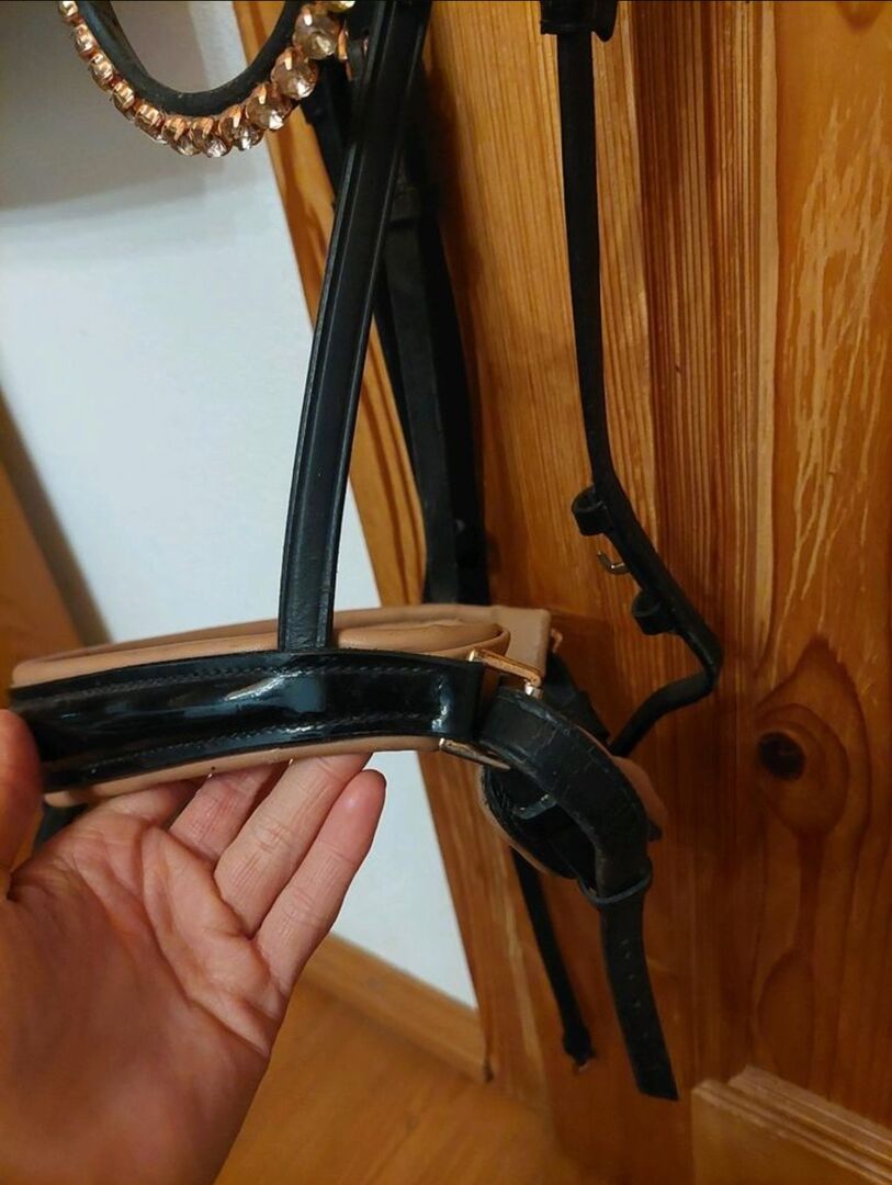 Waldhausen träns roséguld patent WB - Till salu lite begagnat träns av Waldhausen med roséguldbeslag och roséguld Swarovski pannband, svenskt nosgrimma med lack