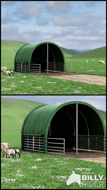 Weideunterstand 4x4 m Premium - 900 g/m² PVC | Unterstand für Pferde, Schafe, Ziegen - Stabilare och högkvalitativare **Weideunterstand 4x4 m Premium** för hästar, schäfrar, dragdjur, alpakor, kälkar och andra nyttodjur. Denna mobila Weidehalle skyddar tillförlitligt mot **Regen, vind, sol och växlande väderförhållanden** och är idealisk som underrede, avlastningsplats eller skyddande viloplats på Weide.