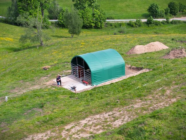 Den stabila konstruktionen av fjäderförstärkt stål ger hög lång livslängd och motståndskraft vid daglig användning. Den starka PVC-plattan är våtbeständig, stryktålig och mycket lämplig för användning i utomhusmiljö. En stor fördel med denna modell är det öppna och fullt användbara innerutrymmet utan innerpoler. Därmed kan hela ytan flexibelt användas som viloområde, foderplats eller väderskydd.