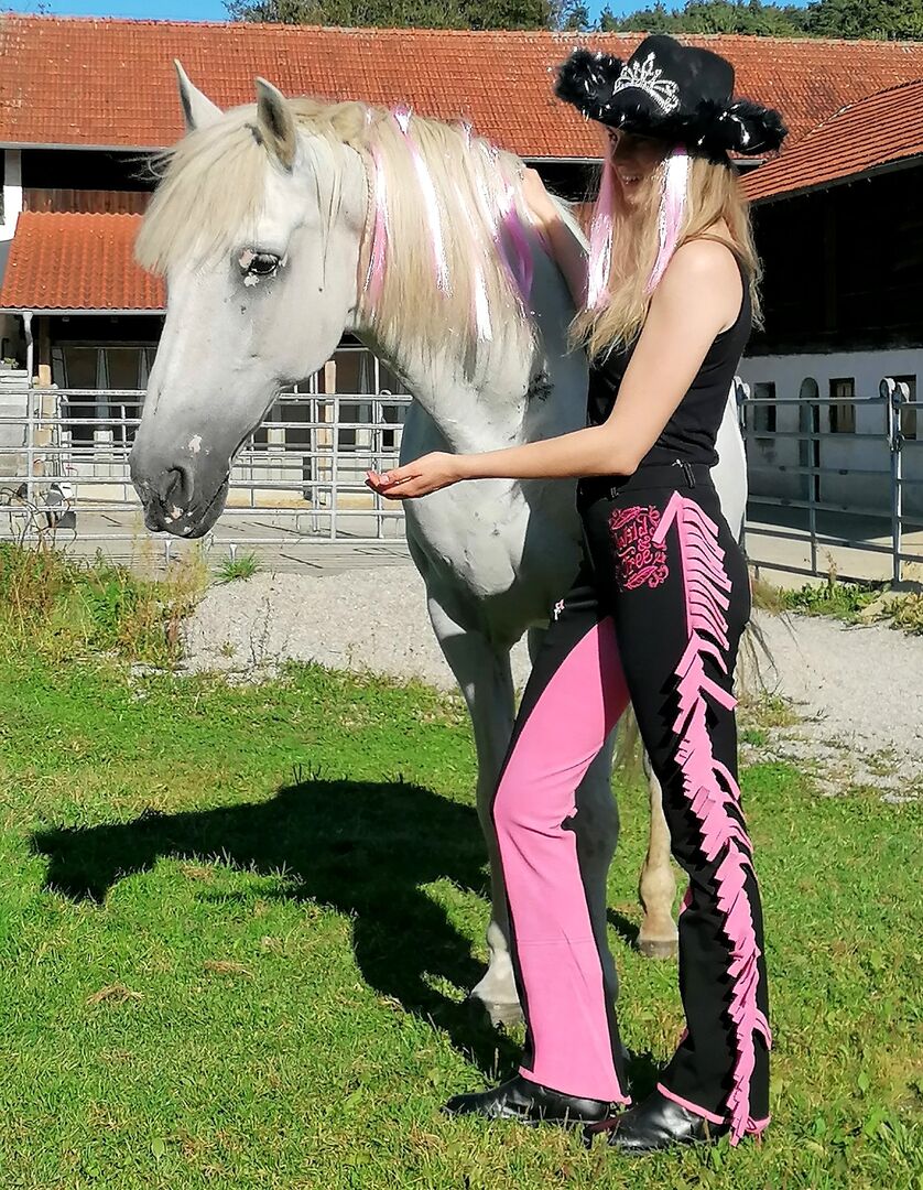 De här coola jodhpurstilen imponerar med sina många detaljer, sin snygga design och sitt sköna, slitstarka material. Framsidan är utrustad med 2 praktiska fickor med dragkedja, som är modernt kryddade med kontrastkanter. Det finns en mobiltelefonficka på höger lår och en sloganbroderi på vänster lår. Det finns fransar av konstläder på sidorna. En cowgirl-lapp på sätet fulländar designen. Den fulla sitsen är tillverkad av slitstarkt konstläder (vegan) och ger optimalt skydd och stöd i sadeln. Benändarna kan fästas vid foten med hjälp av en justerbar resår för att förhindra att de glider i skorna, och de ergonomiska benavslutningarna garanterar en rynkfri passform.