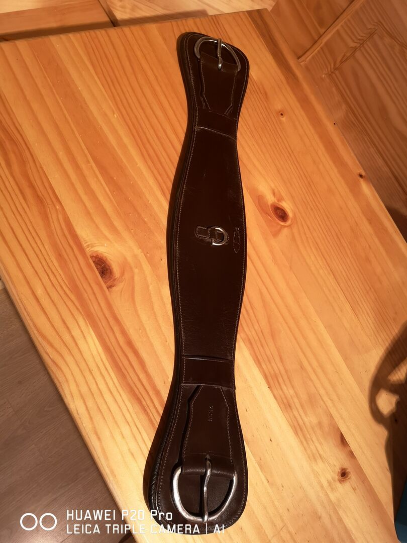 Western Saddle Girth - Erbjuder en grimma för western-sadlar. Den är 75 cm lång och 13 cm bred. Den smalaste delen är 8,5 cm bred. Grimman har en ring i mitten för att fästa bröstplattan. Spännena är 9 cm breda och spiken är 7,5 cm långa. Grimman är tillverkad av läder. Den är nyligen rengjord och smord (med lädervård). Eftersom den är begagnad finns det tecken på användning, främst där spännena sitter. Men de är egentligen bara skönhetsfel.