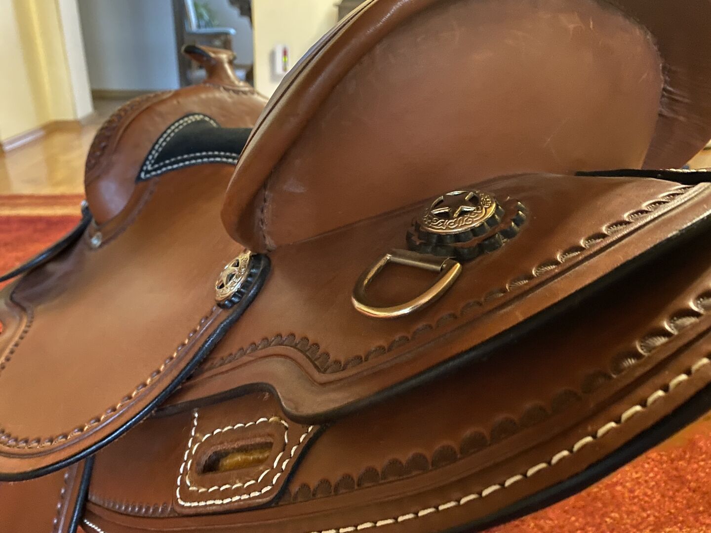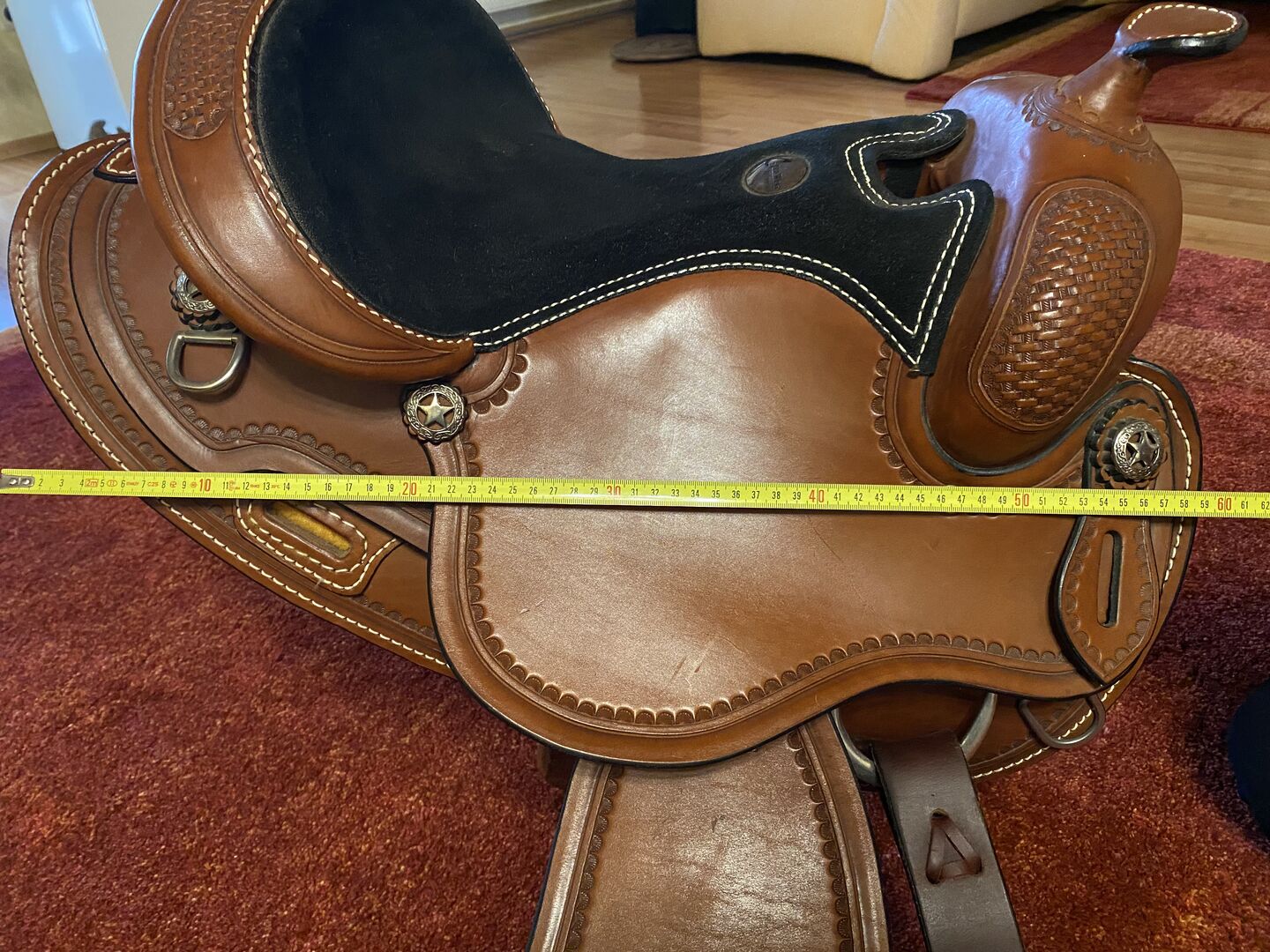 Western-sadel 14 tum - Nästan ny (1 gång på hästryggen) westernlädersadel. Sits av mocka Sitsstorlek 14 tum Mycket vackert arbetade stigbyglar i metall Mätningar av sadeln Rygglängd ca. 64 cm Bredd ca 42 cm Bredd på gylfen ca. 18 cm (mer exakta mått på bilderna)