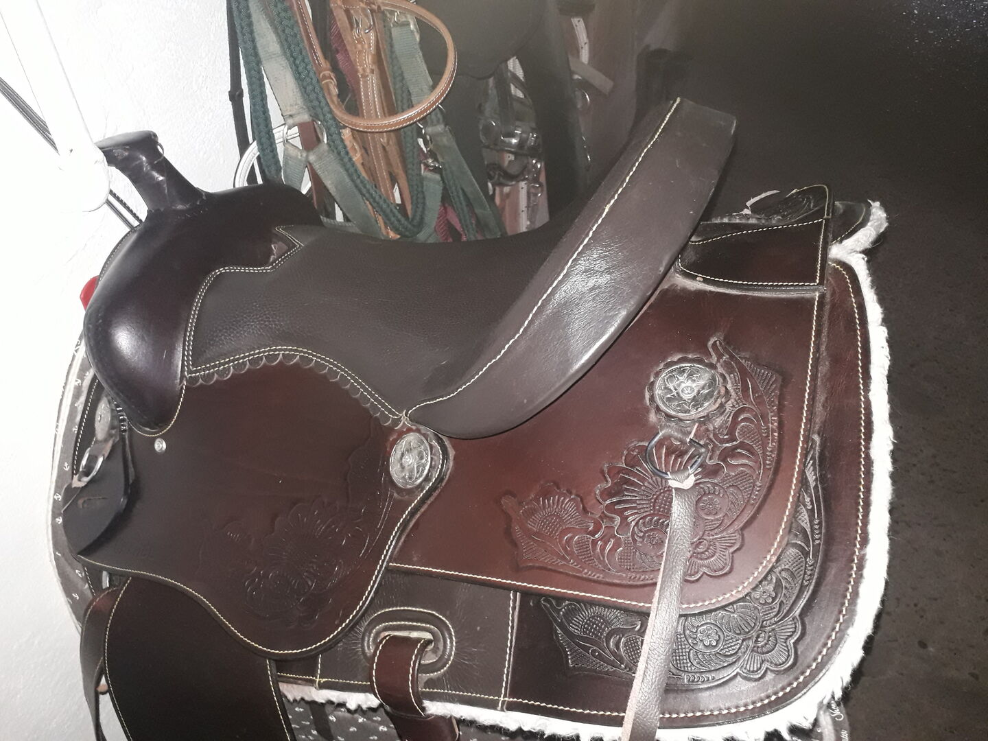 Western-sadel - Jag säljer min älskade western-sadel. Eftersom den är lite för liten för mitt sto vill jag sälja den och hoppas att någon annan kan ha roligt med den. Bra läder Mycket bekvämt säte Kontakta mig för mer information.