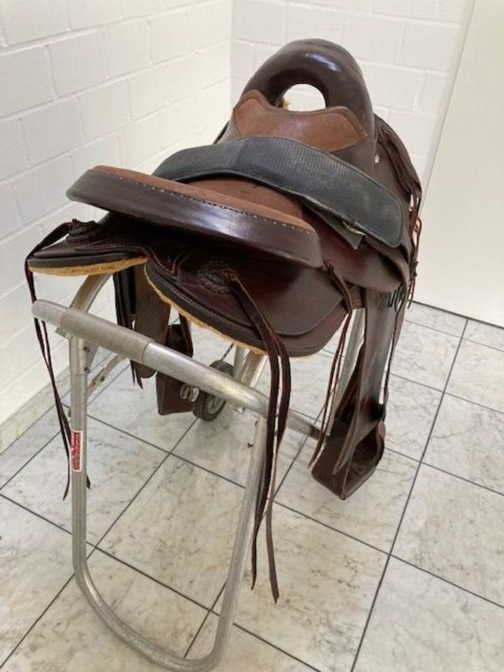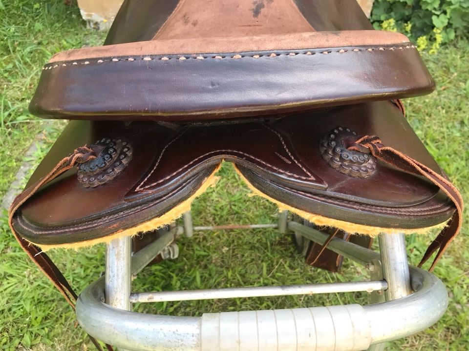 Western-sadel 16' tum - Jag säljer min mycket älskade westernsadel "semi Quarter" utan maggördel, eftersom den inte längre passar min nuvarande häst. Tecken på användning finns. Sadeln tillverkades 2006 och var anpassad till en arabhäst och är skräddarsydd. Den är också tillverkad helt i trä. Sitsstorlek 16' tum Vikt: ca. 12 kg För ytterligare information se foton eller på begäran. Frakt möjlig, men upphämtning i 40223 eller 53225 föredras