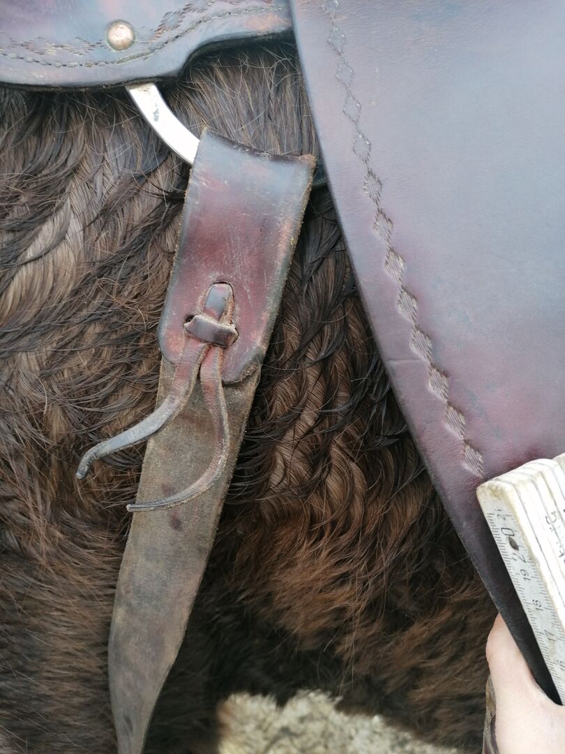 Western-sadel - Gammal begagnad western-sadel med lätta tecken på slitage. Sadellängd 61 cm, maggrimma 90 cm (möjligt på begäran), stigbyglar justerbara. Med mönster på sätet. Handgjord av BILLY COOK SADDLERY Longhom. Bredd 47 cm.