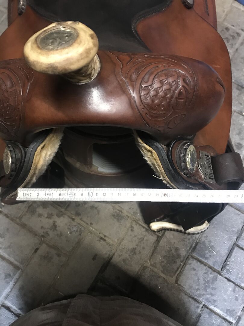 Western-sadel - Hej, Jag säljer min Bighorn western-sadel. Sitsen är 15 tum. Sadeln har ett honungsfärgat mörkt läder, med blomsterverktyg och 6 silverkonchas. Sätet är av nubuckläder. Den har ett råskinnsflätat horn med silverkonchas, en latigo off-billettes bandrem och råskinnsbyglar.