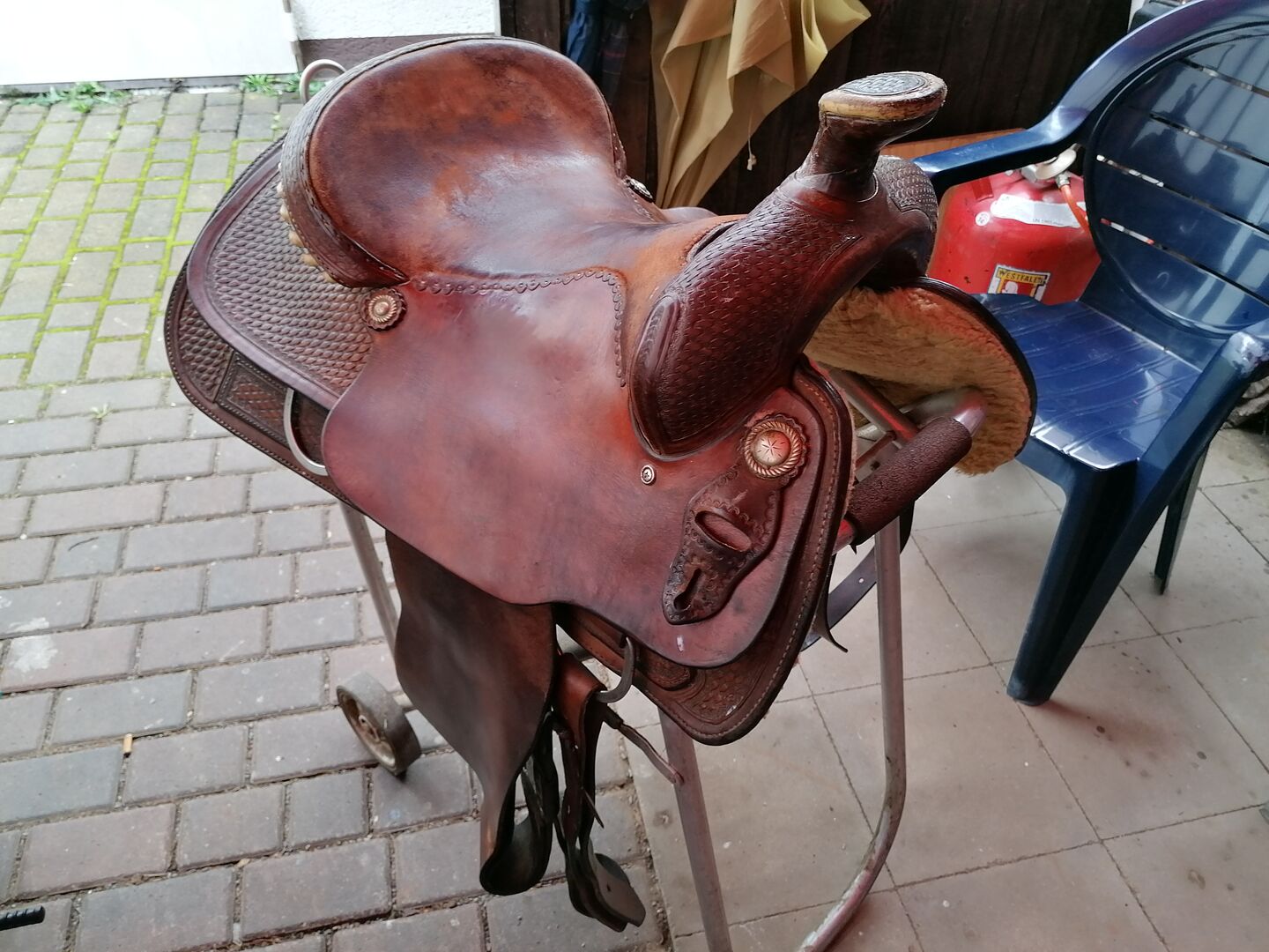 Western-sadel - En riktig sällsynthet! Begagnad arbetssadel från David's (Star of Texas) några tecken på användning, men i gott skick - tyvärr passar inte min unge, annars skulle jag behålla den själv. Lämplig för alla västerländska raser i den bredare typen eller Haflinger och liknande -, Semi Full Quarter till Full Quarter, sväng 54 cm, matstrupsbredd 36,5 cm, concha avstånd 53 cm, total körbana 72 cm, trädet är tillverkat av trä, totalvikt ca 18 kg.