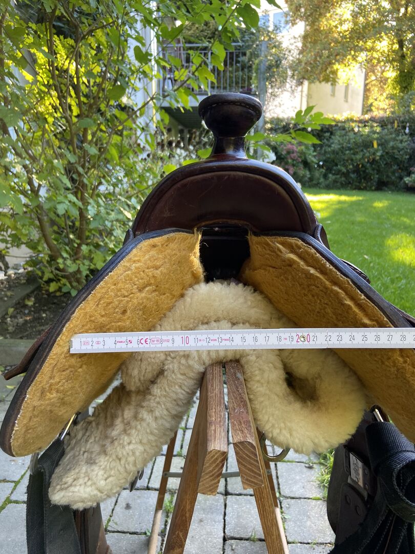 Western-sadel - Jag erbjuder en California Brand western sadel. Den användes på ett litet och smalt Haflinger-sto med en höjd på 1,42 meter. Se foton för andra mått.