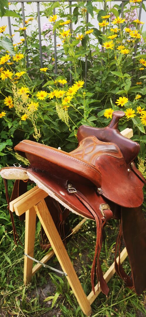 Western-sadel - Jag säljer min westernsadel eftersom den inte längre behövs. Tyvärr vet jag inte märket själv, eftersom jag bara köpte det begagnat. Den totala längden är cirka 59 cm och det är en rundkjol. Förvaras torrt i min lägenhet. Grund för förhandling. Ge mig gärna ett förslag