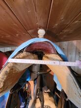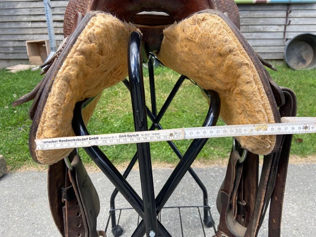 Western-sadel - Jag erbjuder en begagnad western tränings-/arbetssadel till försäljning till ett förmånligt pris. Sadeln visar normala tecken på användning genom åren, men är fortfarande fullt användbar. Råhuden på sadelhornet har tyvärr blivit skadad av möss, men detta påverkar inte sadeln alls. Sadeln har ett FQ-träd med medium swing och 16 mm sits. Frakt möjlig efter överenskommelse