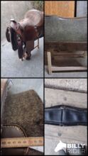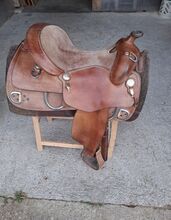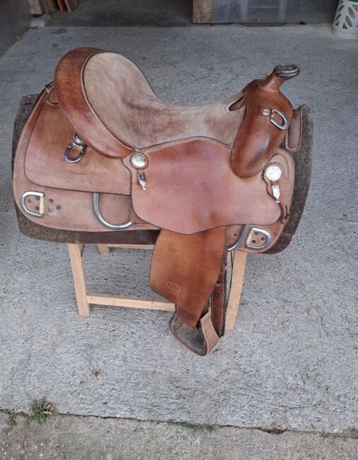 Western-sadel - Jag säljer min älskade western sadel eftersom den tyvärr inte längre är idealisk för mitt sto. Den är superbekväm, vilket är anledningen till att jag inte vill skiljas från den. Den användes först på en Paint och nu på ett smalt sto med lång rygg och normalt vristparti. Normala tecken på slitage.