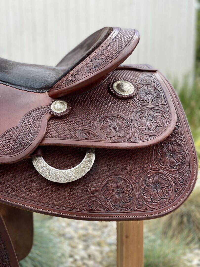 Här är detaljerna: - Dubbelvadderad 16" sits i grovt läder - Horsemanship-sadel (rak och korrekt sits) - Kjol i fjärilsform - Snyggt lammskinn på undersidan - Mönster: Spot Floral Tooling med Spot Micro Basket - Silver chonchos/silverdees - Stigbyglar i aluminium (tillgängliga på begäran)