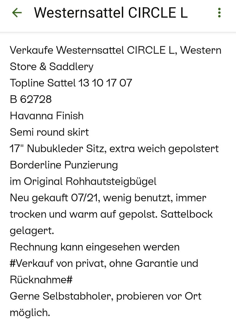 Hi Ina Müller, I am interested in your ad 'Westernsattel CIRCLE L / Topline'. Please contact me! 😊