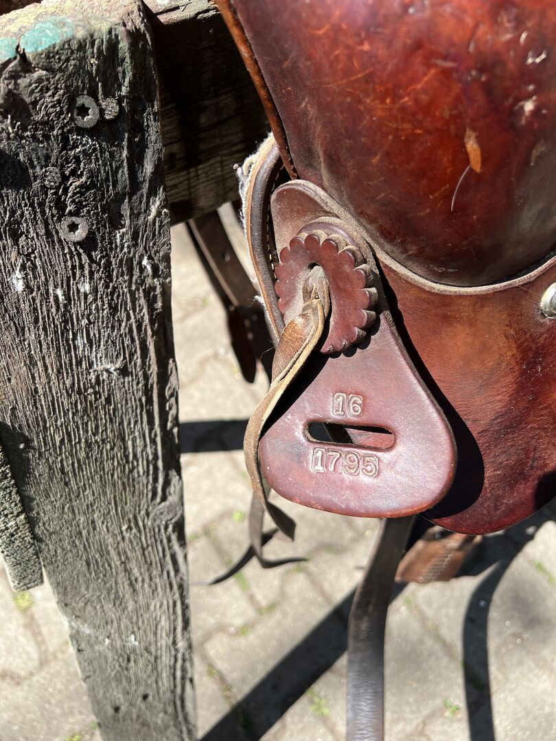 Western sadel | Continental - Sadel - Western sadel till salu (förmodligen Continental varumärke) sitsstorlek 16 tum, hårt säte tidigare monterad på en kallblodsblandning Obs omkrets (slipsknut), bakre omkrets möjlig