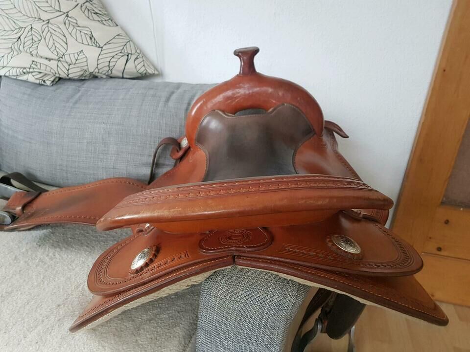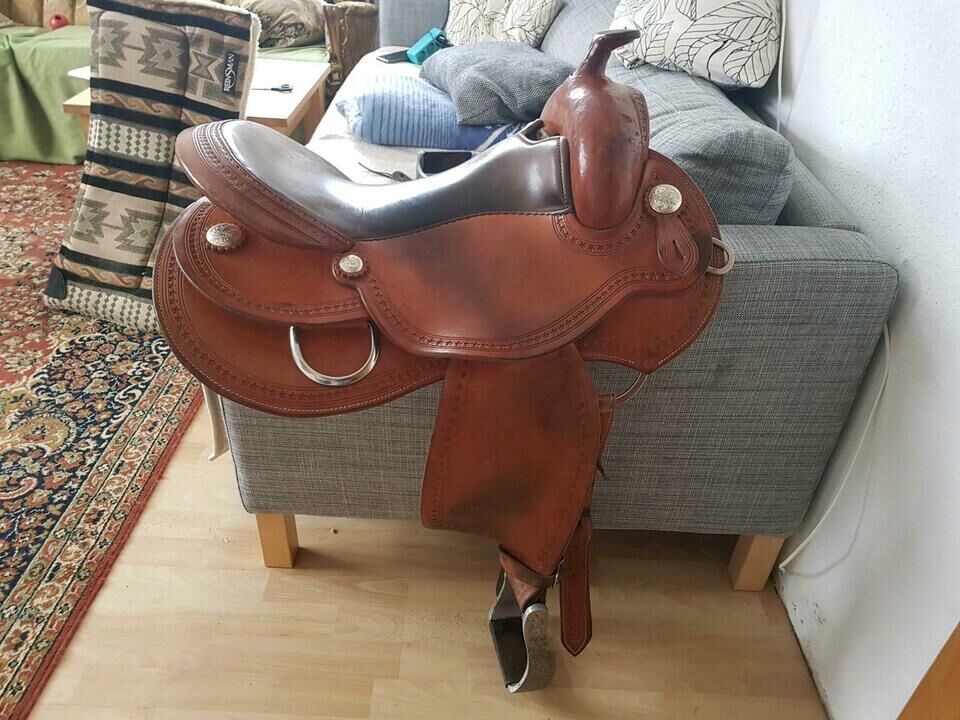 Western sadel från Way out West, Equiflex träd M8NAI (Fullquarter) - Jag säljer min tre år gamla western-sadel från Way out West eftersom den har blivit för smal i axeln för min då femåring. Sadeln, som även passar för korta ryggar, har vridna fendrar med små hålrum. Sadeln (färg "honey oiled") har en förstärkt brun nubuck-sits, 16"; stigbyglarna har en fin gravering. Det ursprungliga priset var 2778 euro. På bilderna kan du se tecken på användning: min ponny hade en gång sadeln obekvämt mellan tänderna, så det finns en liten fläck här. Därför säljer jag sadeln för 1000€ VB. Den är superbekväm och har i övrigt använts relativt lite, eftersom jag ofta bara åkte med ett underlag och min femåring ännu inte har ridits regelbundet.