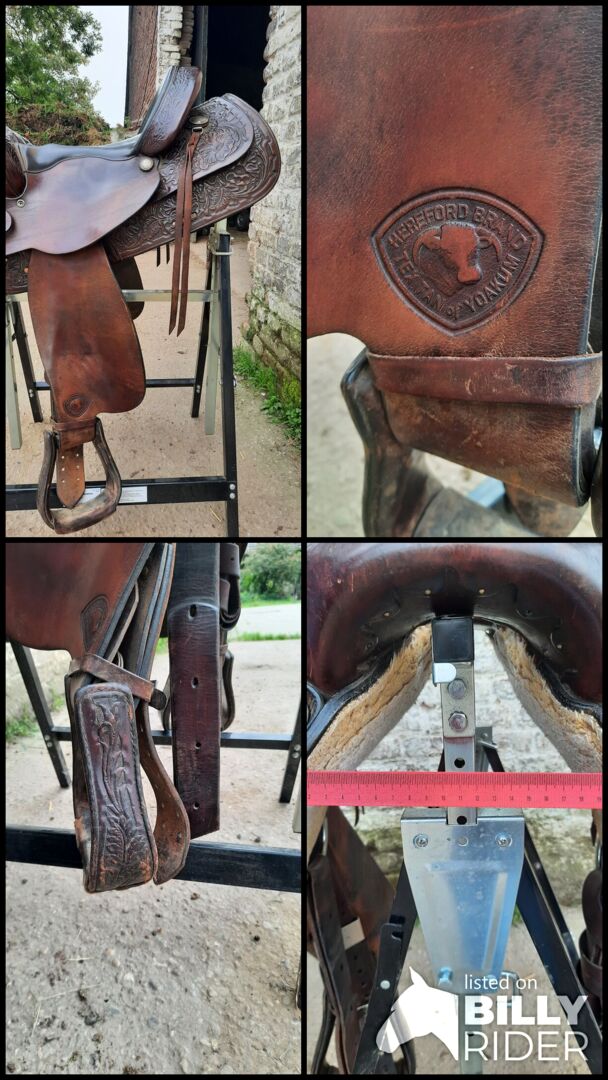 Western-sadel i mycket gott skick - Denna vackert hallstämplade, Tax Tan Herford Brand yoakum har tyvärr blivit för trång för min unga häst, används därför inte längre och är därför till salu. Vänligen se bilderna för mått. Sadeln användes till en smal Quarter Horse för inridning. Lämplig för hästar med smala axlar och korta ryggar.