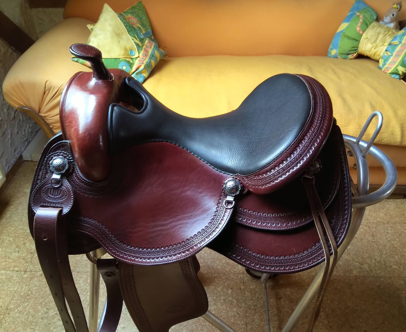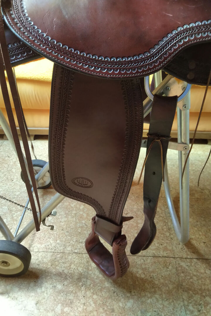 Western-sadel så bra som ny - Här erbjuds en western-sadel från tillverkaren LE Selle italiane Beskrivning av sadel: Träd: Träträd från USA - storlek Full Quarter (lämplig för Quarter, Appaloosa, eventuellt Haflinger) Kammarens bredd: avstånd mellan conchas 22 cm Total längd 65,5 cm - Rundade kjolar - Fjärilsutskärning, för att sitta nära hästen Sits 16 tum tillverkad av slätt läder Lätt allsidig stämpling Sadeln köptes 2019 till ett NP på 2 400 € och användes sällan på grund av hästens sjukdom. Den är därför i ett mycket välskött, nästan nytt skick Pris VHB 1.600 euro Ingen garanti eller retur möjlig på grund av privat försäljning Sadeln kan tas med för montering på hästen inom en radie av 50 km runt 95700 Neusorg.