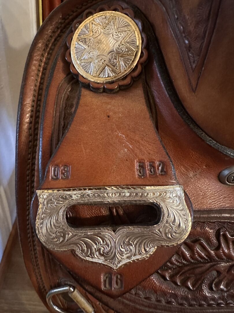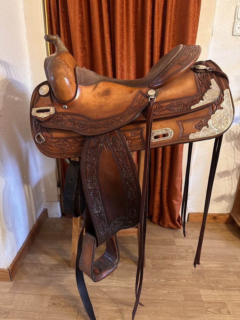 Western sadel, show sadel Deuber och partner - Jag erbjuder en fantastisk western sadel från Deuber und Partner. Silverbeslagen gör den till ett blickfång för utställningar och föreställningar. Detaljer kan hittas på bilderna.