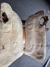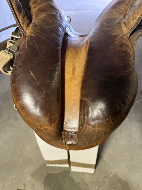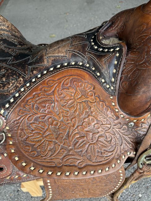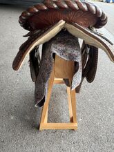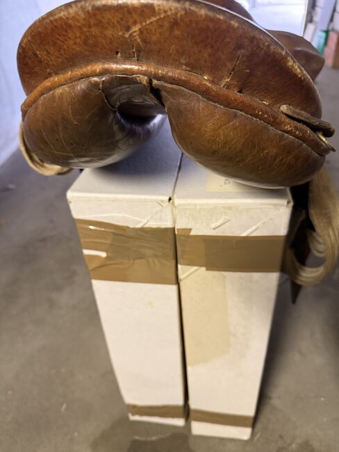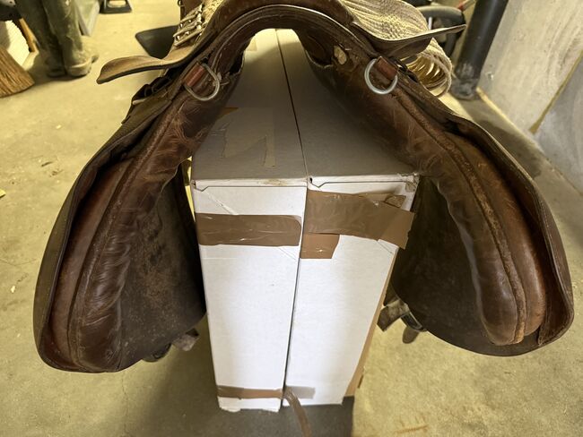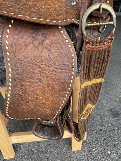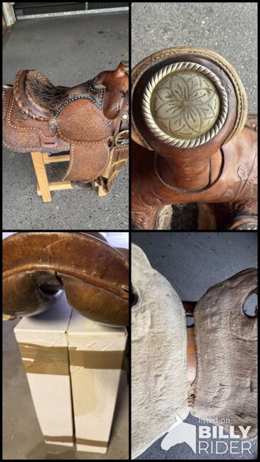 Gepflegter Westernsattel; gekauft in den USA vor gut 10 Jahren. Gekauft haben wir ihn grundsätzlich um mit ihm auszureiten, die Pläne für einen Pferdekauf haben sich aber zerschlagen. Somit haben wir ihn im Haus als Schmuckstück gehegt und gepflegt. Abgegeben werden kann zudem auch noch ein aus unserer Sicht immer noch brauchbarer Sattel in der Grösse 17.5 Zoll (44cm) der Marke J.A. Barnsby % Sons.