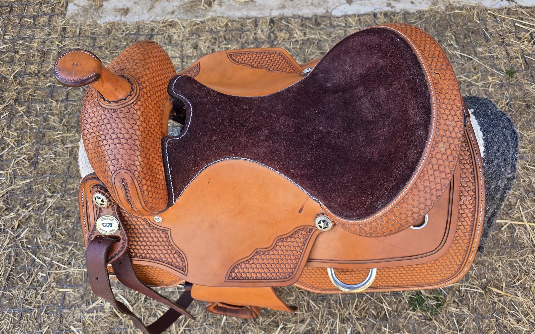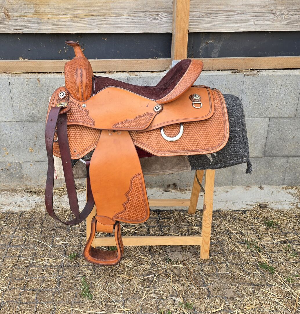 Western Sadel Western Imports Korg Reiner Pad Girth Bröstplatta - Säljer min westernsadel av märket Western Imports Basket Reiner i cognac sitsstorlek 16" med western pad lammskinnsgjord 32" och bröstplatta. Sadeln har knappt använts se bilder. Vänligen se bilder för mått. Frakt möjligt till kostnad. Provning och utprovning är möjlig efter överenskommelse på plats eller med deposition av köpeskillingen för att ta bort.