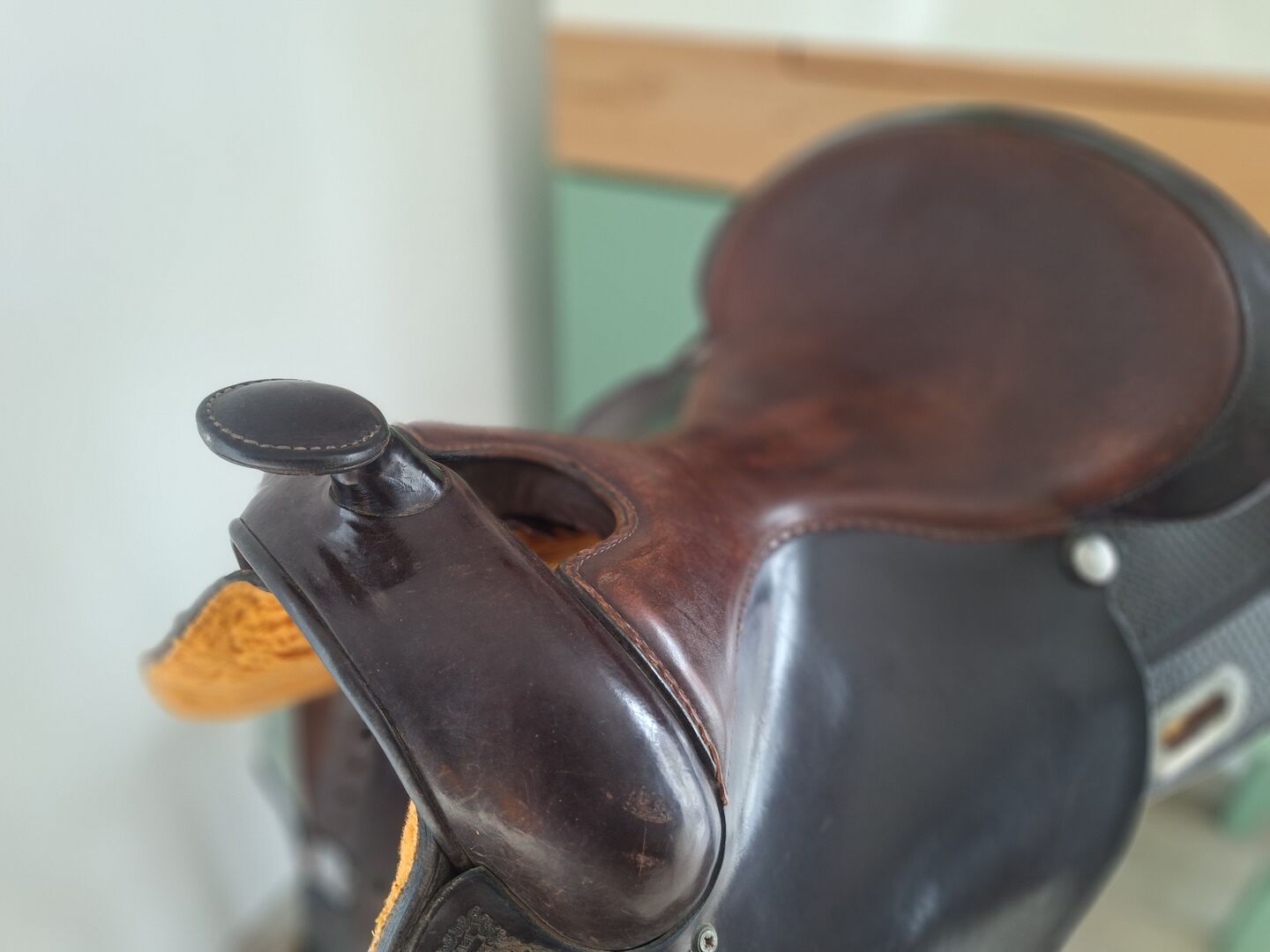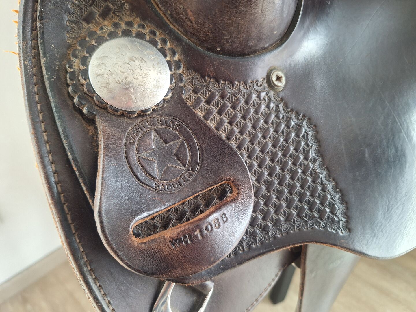 - White Star Saddlery - ¾ Stansning av korg - Färg: Chessnut (mörkbrun) - Längd: ca 64 cm - Reining-säte: 16 tum - Concha-avstånd: ca 19,5 cm - Hållare för knytband med silverkant - Concha saknas på höger sida - Stigbyglar av trä