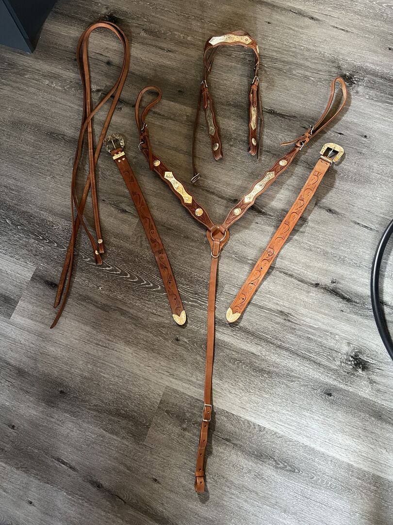 Western Show Set träns och bröstplatta Full WB - Jag säljer ett begagnat western show set bestående av träns med delade tyglar och bröstplatta samt två remmar, vars syfte jag tyvärr inte vet (jag kommer inte från westernområdet). Jag fick allt med sadeln, men har inte använt den då den är för liten för min häst. Sadeln passade men tyvärr har min häst vanligtvis en kallblodsstorlek, så den passar inte. Kanske någon har användning för den. Lädret är i bra skick, kan behöva lite omsorg, liksom beslagen, som är lite missfärgade men bör lysa igen med rengöring. Lädret är inte styvt! Satsen användes inte ofta av de tidigare ägarna. Jag säljer setet som det är, ingen individuell försäljning. Vänligen skriv till mig för mätningar, jag kommer gärna att ge dem till dig. Vänligen beskriv bara en gång direkt vilka dimensioner som önskas :) Satsen har toppjusteringsalternativ, så den kan säkert också anpassas väl till kvartaler.