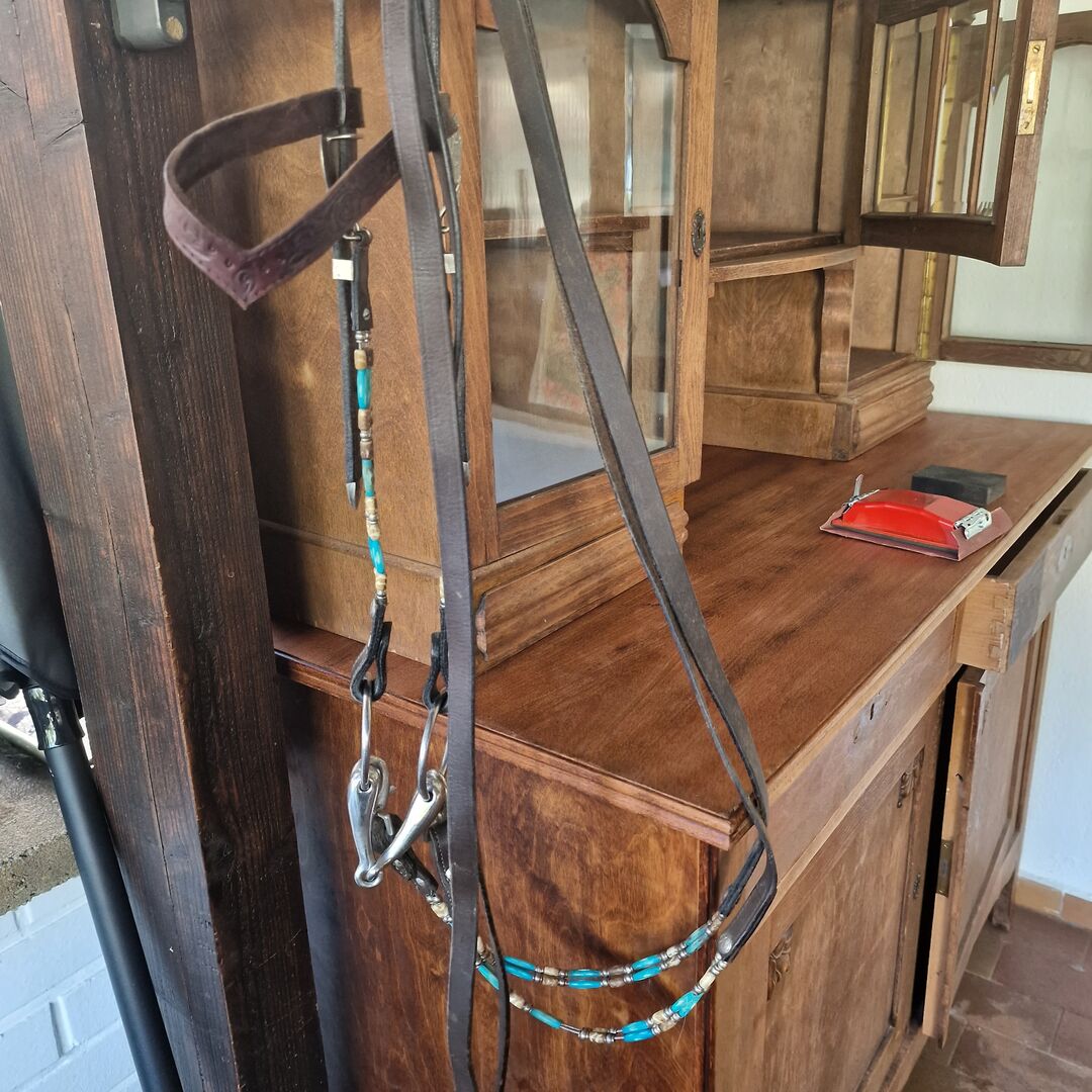 Western snäppa stor WB KB - Här erbjuder vi en vacker western snaffle med fantastiska turkosa pärlor och stippling. de matchande splitrains ingår.