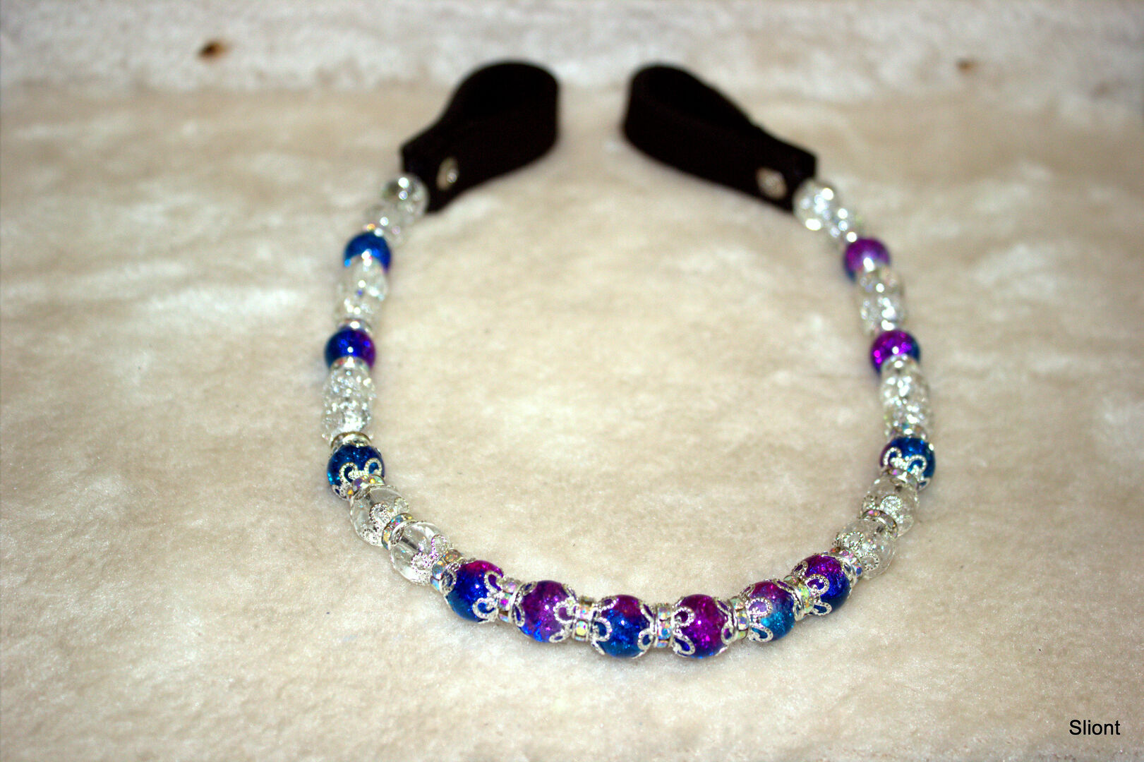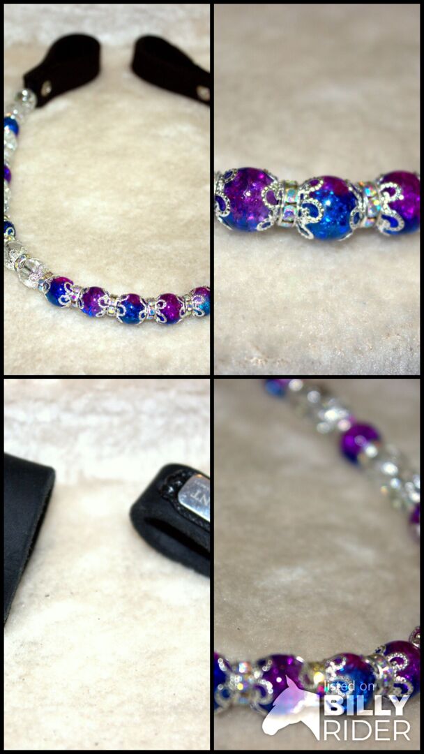 Jag erbjuder ett exceptionellt pannband, storlek warmblood, 43 cm. Eftersom det här pannbandet inte tillverkades i serie är det ett sällsynt fynd. Tack vare kombinationen ''Royal Blue & Mauve Violet'' kan det här pannbandet hålla jämna steg med många färgkombinationer och ser samtidigt charmigt och trendigt ut. Materialen i pannbandet är av hög kvalitet och kommer från Tyskland och är därför klimatneutral. Fraktmetoden är också klimatneutral. Slingorna är tillverkade av äkta fett läder och är därför hållbara. Pärlorna är naturliga och färgade kristallkvartspartier.