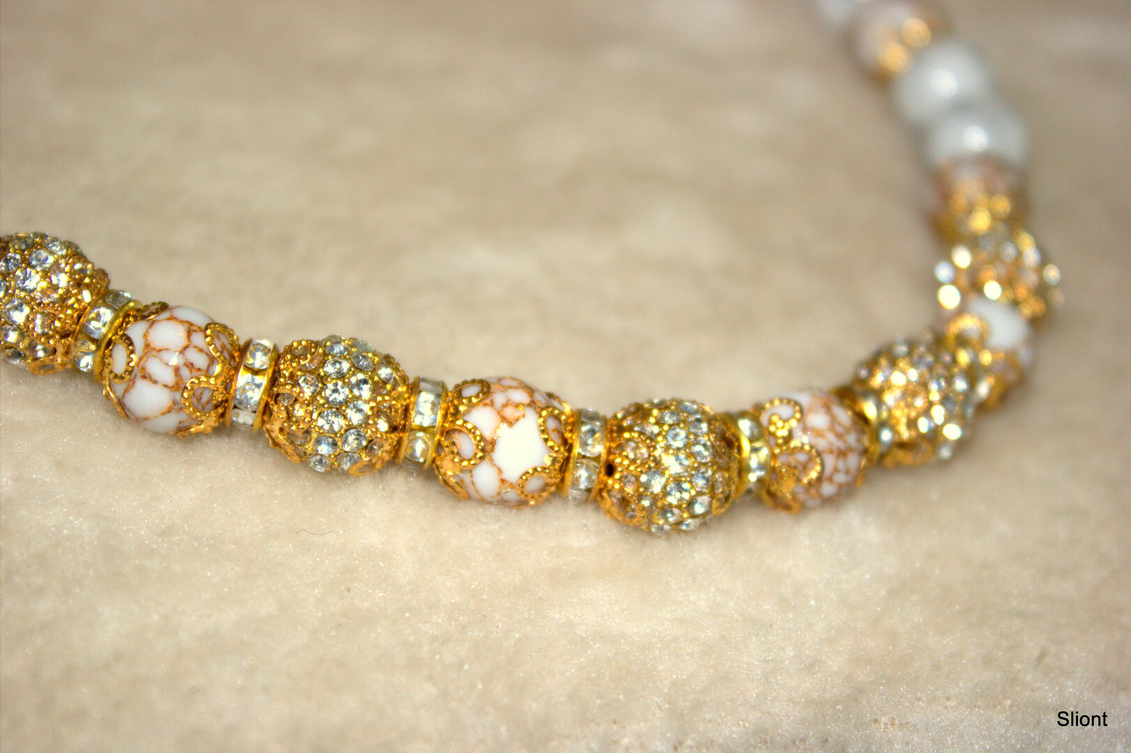 Jag erbjuder ett exceptionellt pannband, storlek warmblood, 43 cm. Eftersom det här pannbandet inte tillverkades i serie är det ett "sällsynt fynd". Kombinationen "Honey Gold & Pearl Porcelain" gör att det här pannbandet passar till många färgkombinationer och samtidigt ser det attraktivt och trendigt ut. På utställningar skulle det här pannbandet vinna ett extra guld. Materialen i pannbandet är av hög kvalitet och kommer från Tyskland och är därför klimatneutrala. Fraktmetoden är också klimatneutral. Slingorna är tillverkade av äkta fett läder och är därför hållbara. Pärlorna är naturliga pärlor och riktiga pärlor av rostfritt stål med kristallpärlor. De mellanliggande pärlorna är runda mikrokulor.