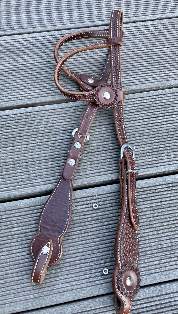 Western-träns med dubbla öron, hakrem och tyglar - Säljer denna vackra och välbevarade två-öriga western snaffle gjord av ljust läder med blommiga ornament. Breda kindstycken, dubbelsydda. Hakrem ca 60 cm. Tyglar med en längd på cirka 270 cm skulle också vara tillgängliga. Allt tillsammans för 70,- Euro Huvudstall singel 45,- Euro