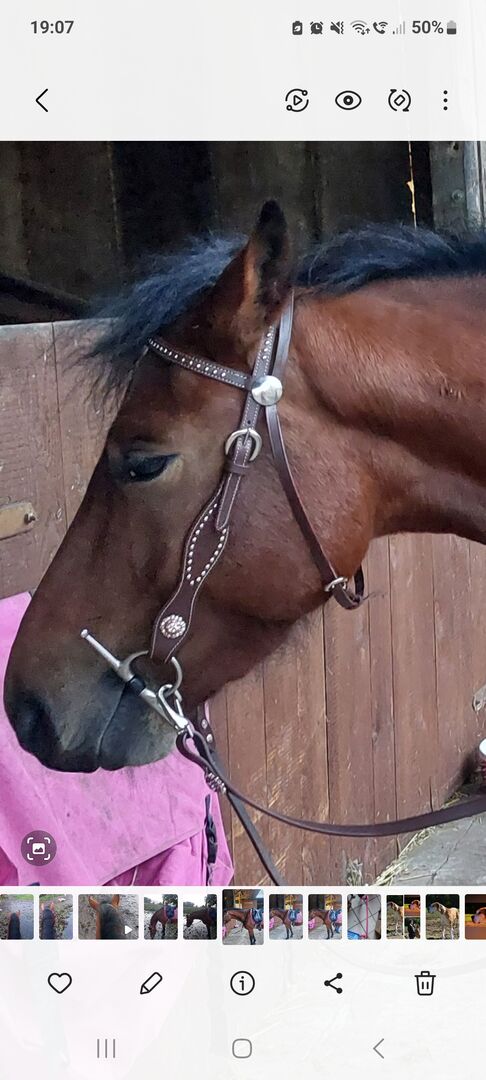 Western träns, storlek Cob - Säljer ett knappt använt western träns, på grund av färgbyte. Utan conchias, originalskruvarna är tillbaka på plats. Med matchande tyglar ingår