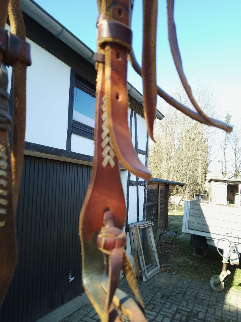 Western-träns tillverkat av läder - *Västligt träns* - Träns till stor häst med dekorationer i gott skick, utan bett. Om du är intresserad har jag också en påse med välsmakande hästfoder som är lämplig för daglig användning. Blanda med vatten, ren häst, foder (20 minuters blötläggningstid)Blandning av lusern, betmassa, linfrömjöl, linolja ... 15 Kilo 15,- € frakt möjligt