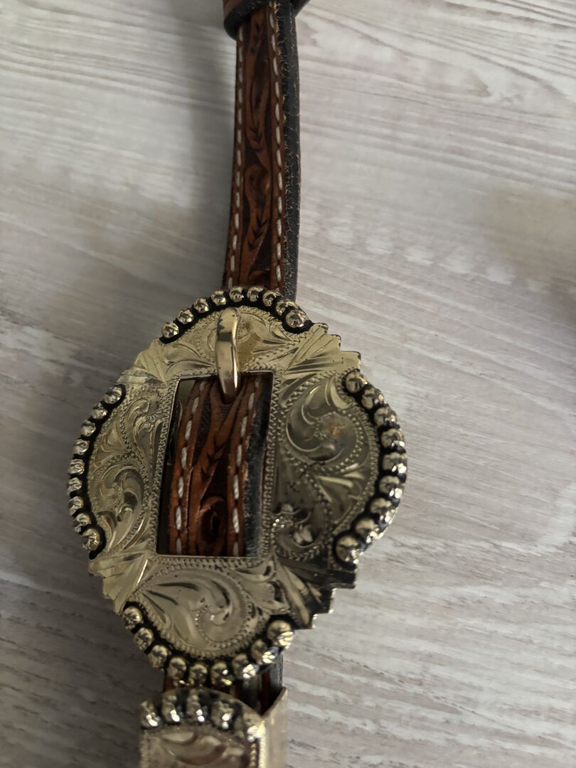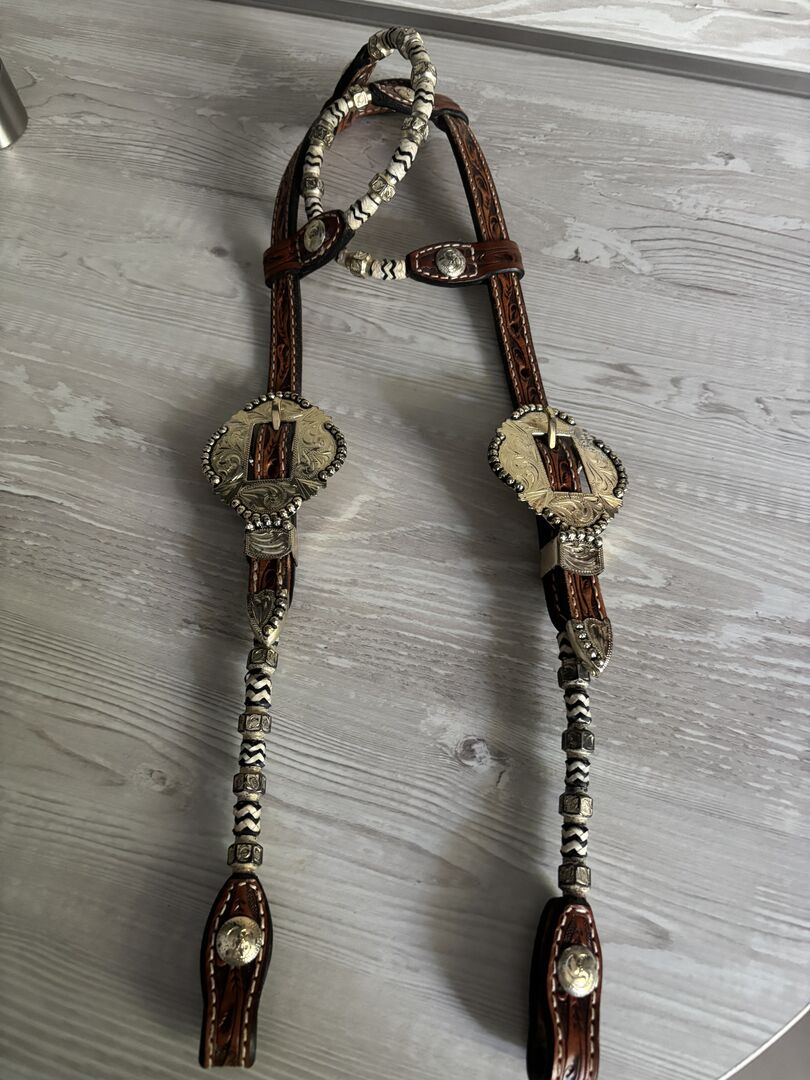 Western tvåörat utställningstrygel nytt - Jag säljer min tvåöriga show snaffle. Ännu inte använt, har alltid förvarats inomhus. Mycket bra skick. Justerbar på båda sidor. Se bilder för ytterligare detaljer.