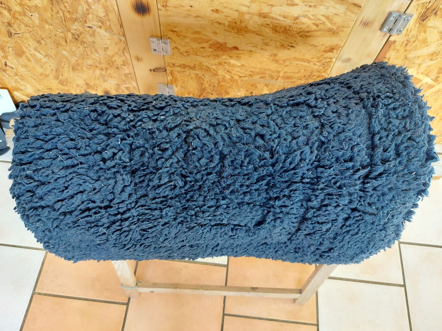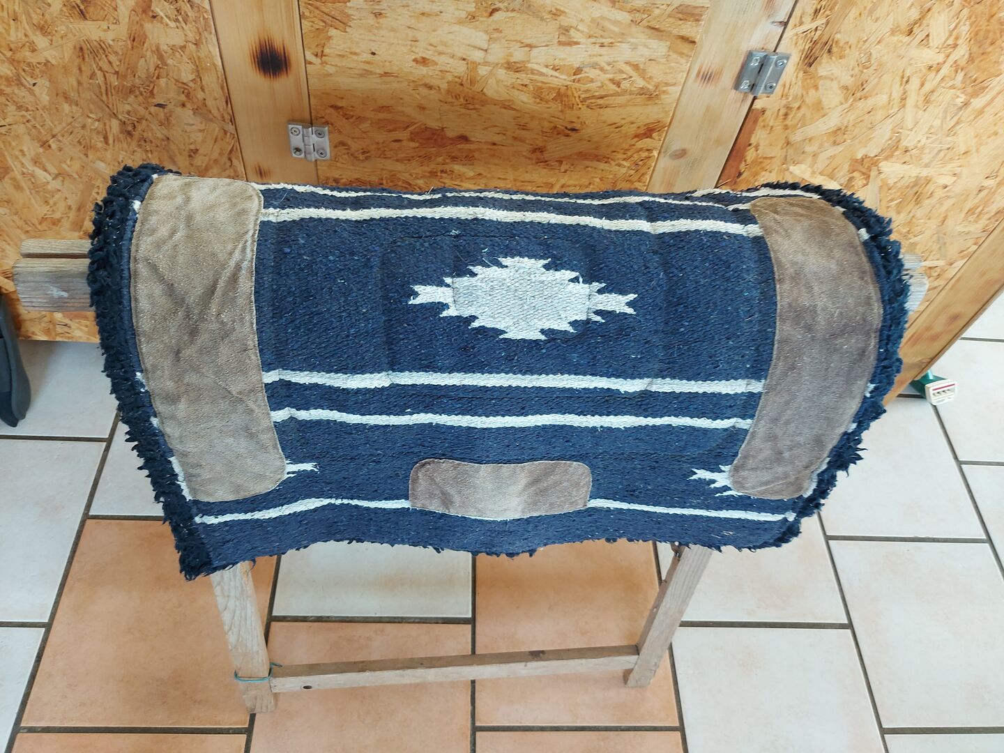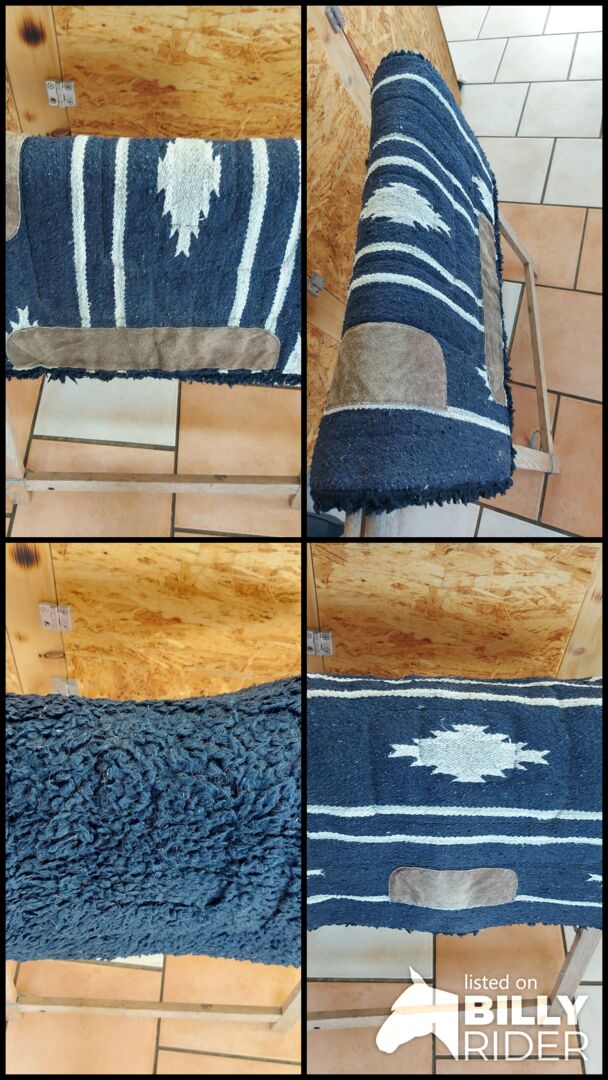 Säljer en blå/vit västerländsk pad, det finns inget slitage på läderinlägget. Kudden mäter 64×64× ca 3 cm.
