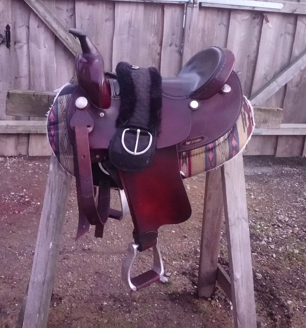 Westernsadel med sadelgjord och pad - Jag säljer min begagnade men välskötta westernsadel inkl. pad och sadelgjord (70cm). Det är en Texas Best-sadel, modell 1346 - se bilder för mått. Sadeln har alltid förvarats torrt och underhållits regelbundet, men visar några tecken på slitage (läder slits vid stigbygeln - se bilder). Vikten är ca 12 kg. Vänligen kontakta oss om du har några frågor.