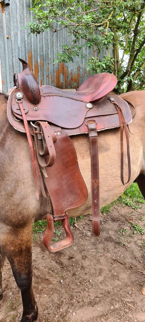 Westernsadel med tjock stoppning - Begagnad, elegant westernsadel. Tjockt vadderad... Tyvärr är gullet på gummit lite skadat men kan tas bort ... Har varit på hästen 3 gånger och förvarats torrt sedan dess... Vänligen se bilder för mått... Frakt möjlig om kostnaderna betalas i förväg... Sits 16 tum