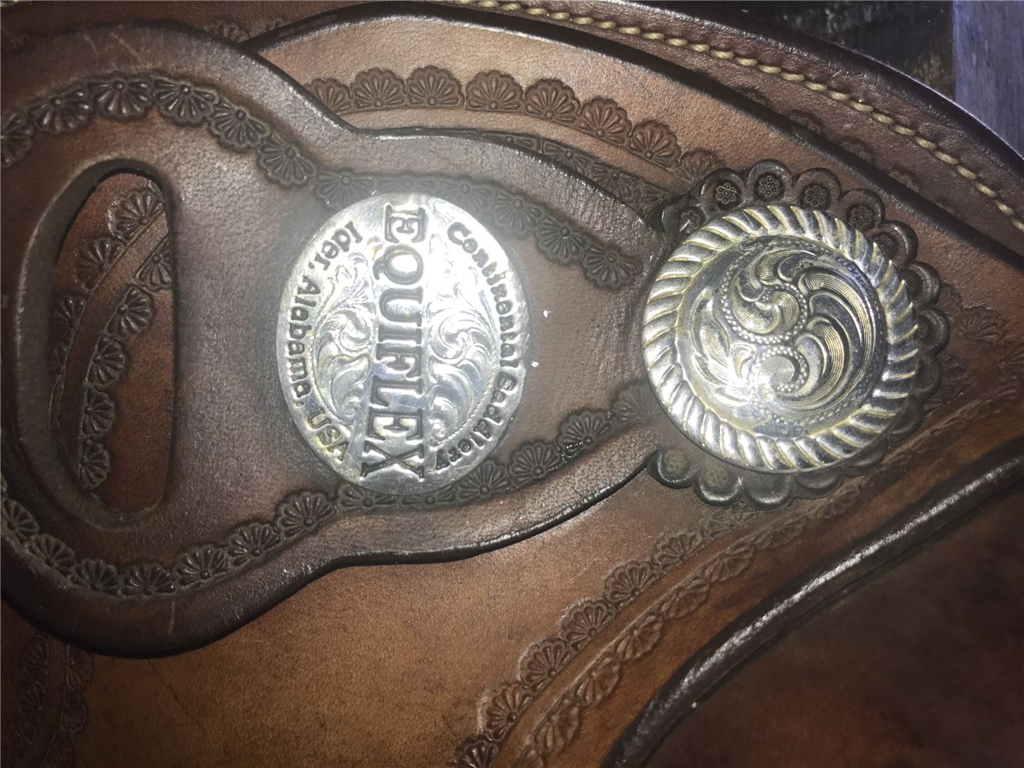 Vackra dekorationer på kanten av sadeln, silver graverad concho (spänne/ornamentala element)