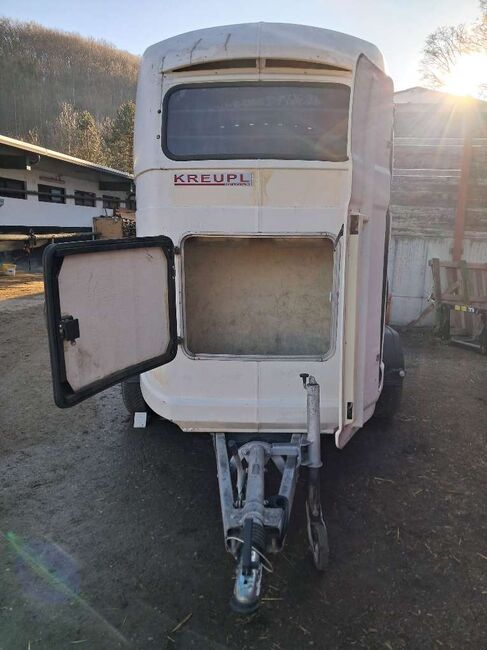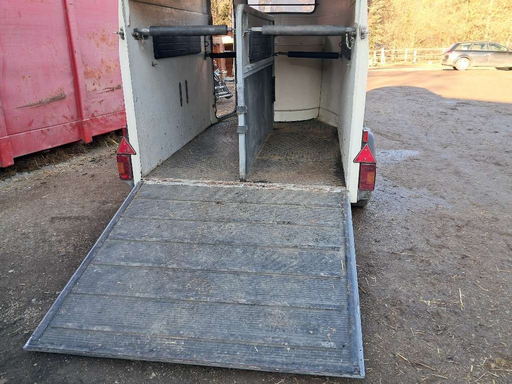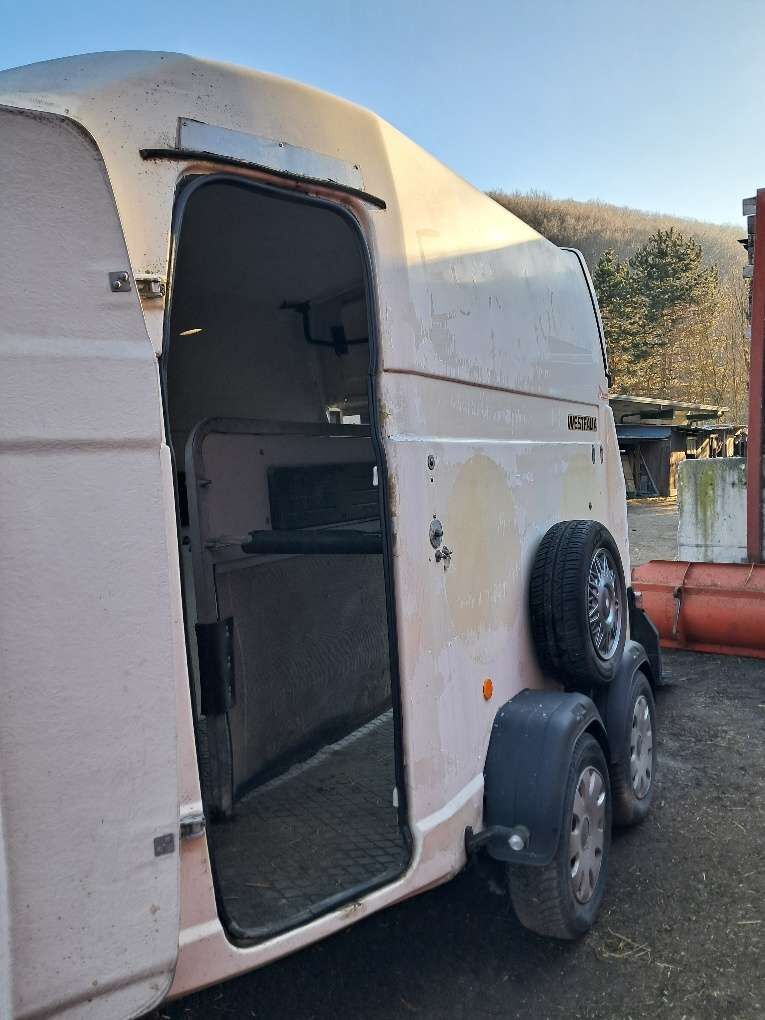Westfalia släpvagn för två hästar - Till salu på grund av nytt förvärv: Westfalia Jupiter vit poly trailer för två hästar Ljus, vänlig inredning, så mina djur kom in mycket lätt. Mycket lättkörd och spårbunden, original Westfalia-drift Robust skiljevägg, helt löstagbar eller lutningsbar Sidovaddering (även på skiljeväggen) och vadderade stänger fram och bak Sadelkammare med extra ingång framtill, servicedörr i full höjd framtill till vänster Gummigolv som är limmat med strukturen, ingångsramp med gummi och slitbanor Förnyelse: golv (komplett), D-koppling, brytsäkringskabel och däck 2020, stötdämpare och bromskabel 2023. EZ 08/2001