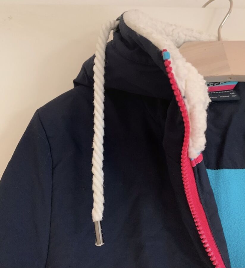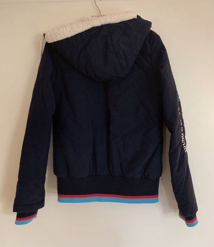 Jag säljer här en fodrad vinterjacka med huva. Jackan har burits flera gånger och är i mycket gott skick. Jackan har två fickor med dragkedja, en Steeds-logotyp på bröstet och två band på huvan.