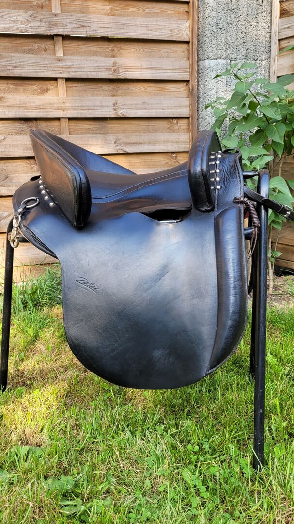Zaldi Mixta Spansk sadel - Begagnad sadel av spanskt märke till salu från Zaldi-företaget, även populär i Tyskland. Modell Mixta, serienummer 994396 med normalt 14 tums säte (westernstorlek, motsvarande dambyxor storlek 36-40), ca 36 cm mellan gallerierna. Färgen är svart. Kammarens bredd smal-medium. Total längd ca 48 cm, kontaktyta ca 45 cm. Sadelklaffens längd från sadelgjorden ca 32 cm. Låravstånd mellan gallerierna ca. 20 cm. Monterad på en normal 142 cm Camargue.